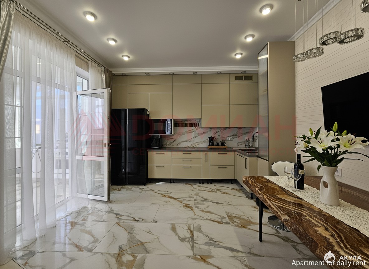 Шикарная кухня-гостиная 40кв, с выходом на застекленную террасу. Кухня оборудованная по последнему слову техники. Австрийские подъёмники, установленные на кухонном гарнитуре добавят вам дополнительно удобства при эксплуатации. Грамотно зашитая сплит система в кухонный гарнитур, не будет мешать вашему взору в зимние время.