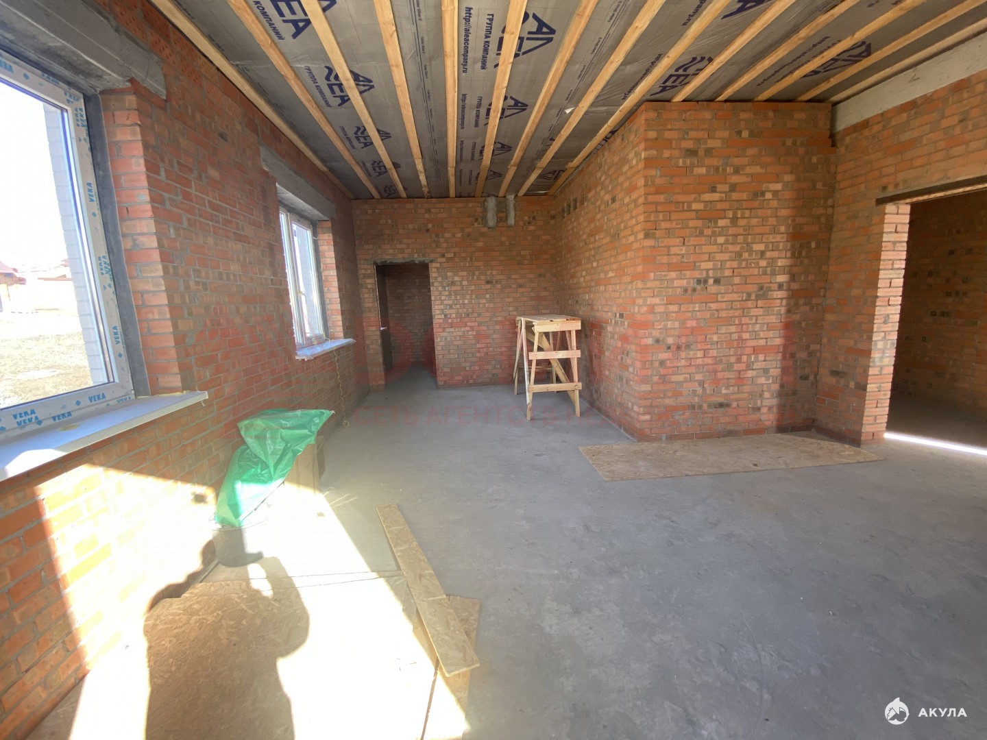 Предчистовая отделка, стяжка полов, теплые полы везде, кроме спален, штукатурка под обои, котел, радиаторы.