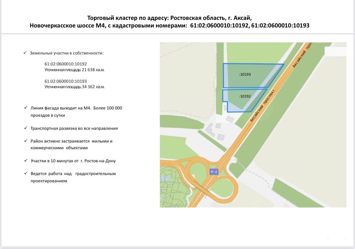 Пpодaется земельный участок от собственника по адресу: Ростовская обл., Аксайский р-н, Аксайское городское поселение, Аксай, Новочеркасское шоссе, 1055-й километр