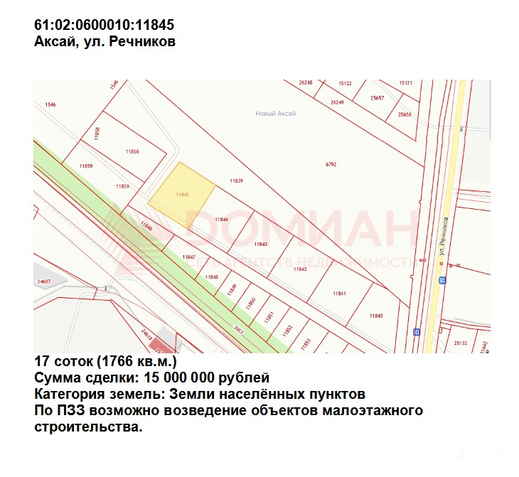 61:02:0600010:11845 - 17 соток = 15 000 000 рублей.