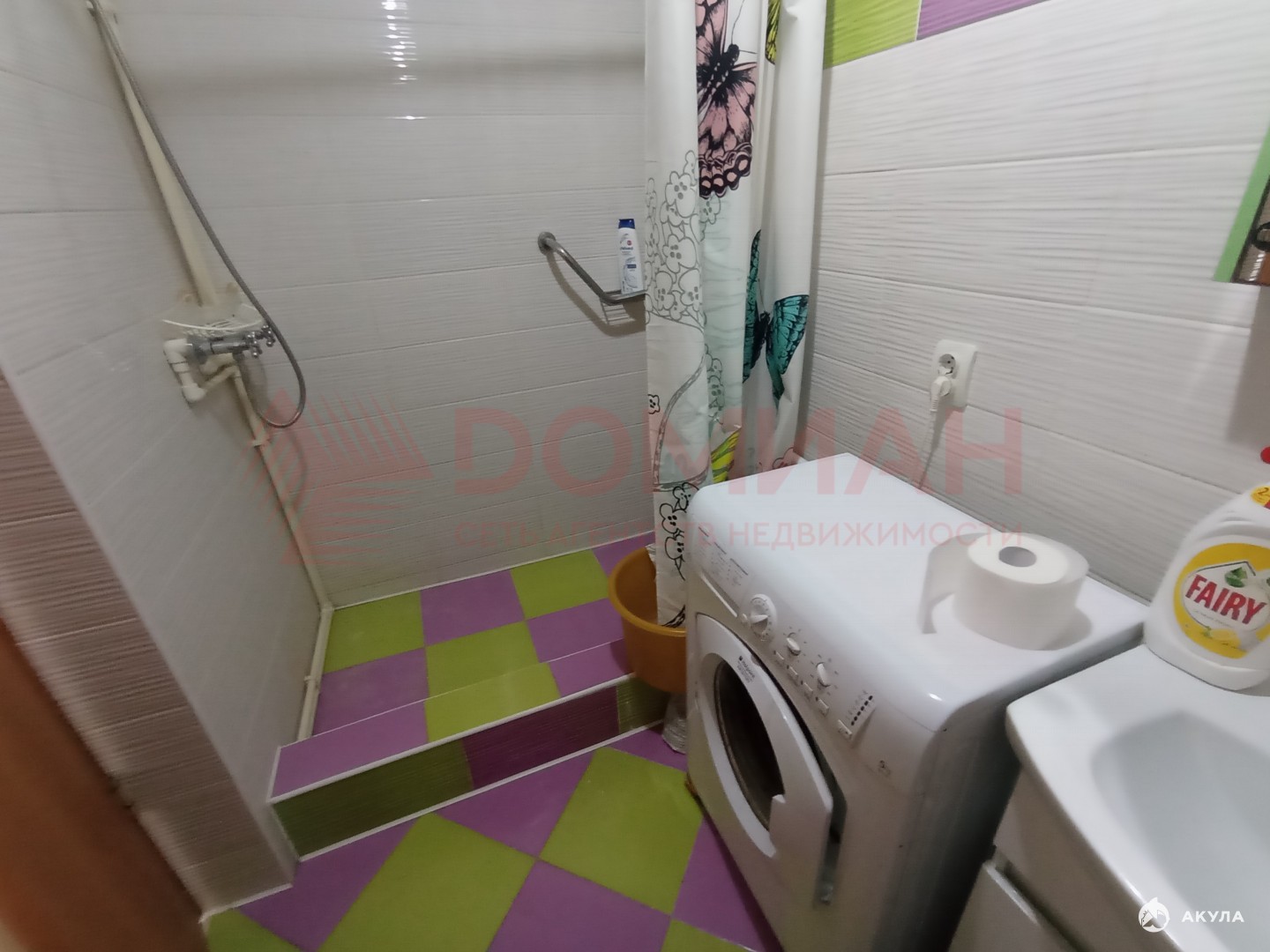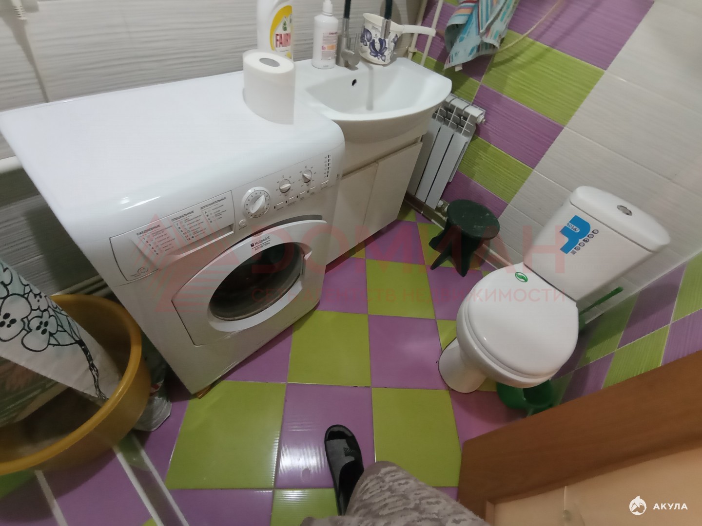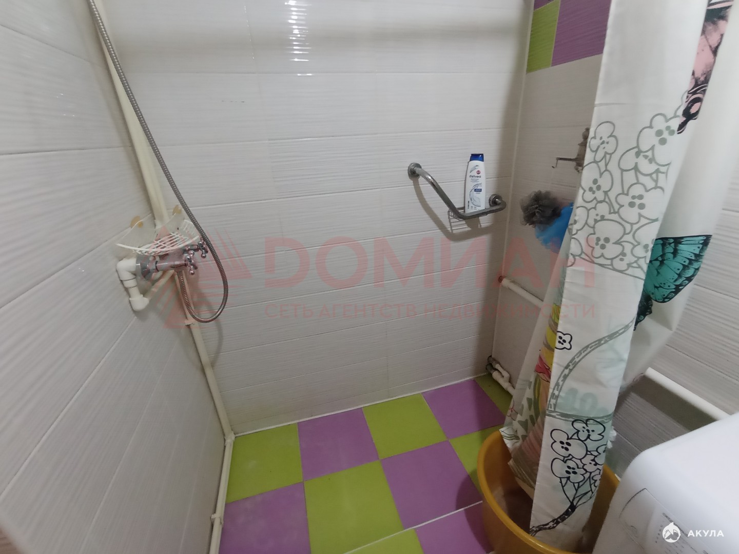 Cовмещенный сaнузeл c дешевой кабиной выложен кафелем.