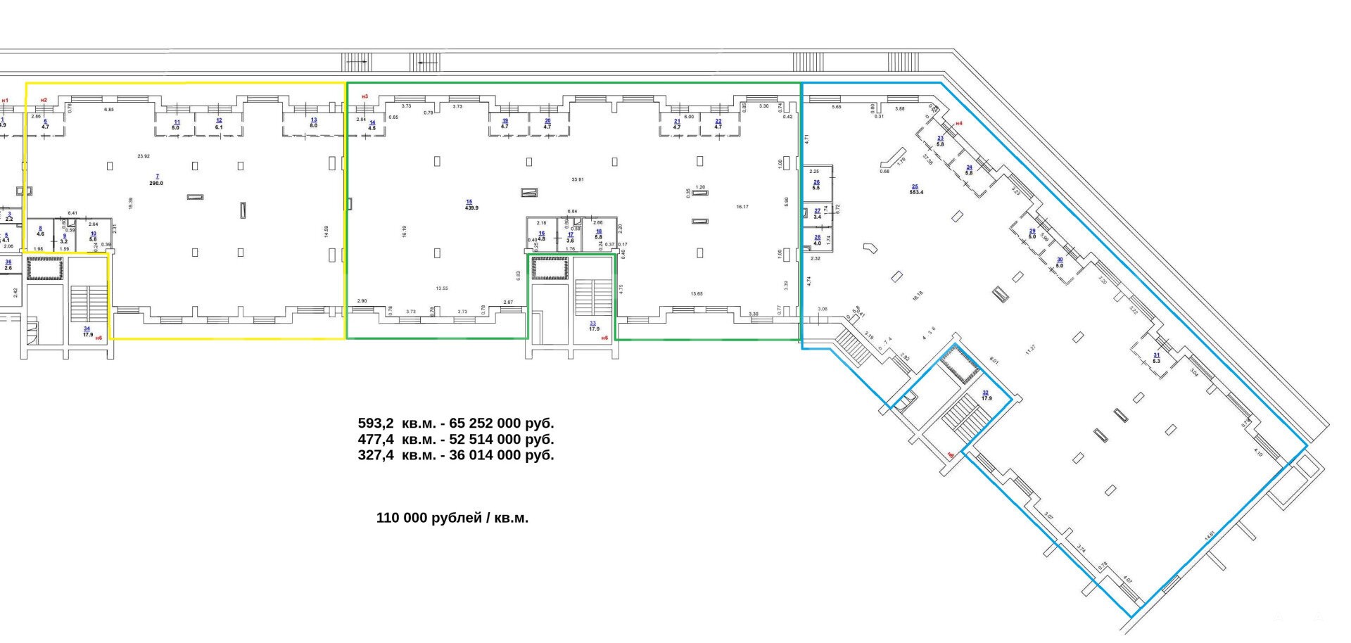 - 1я линия, фасад, витрины, от 1 до 4 входов в блок (в зависимости от площади выбранного блока).