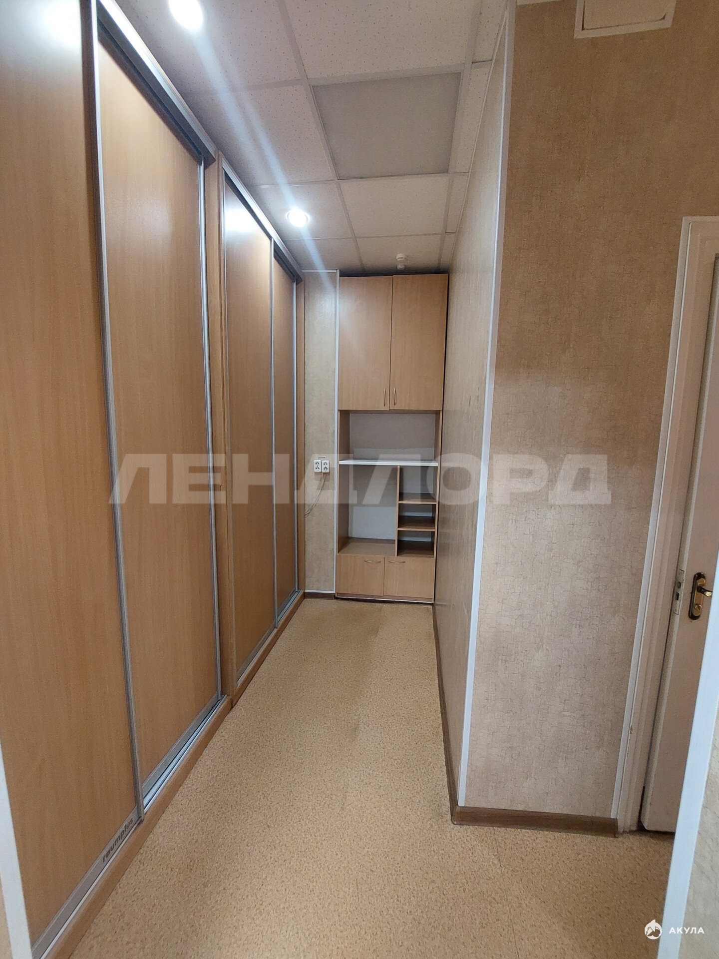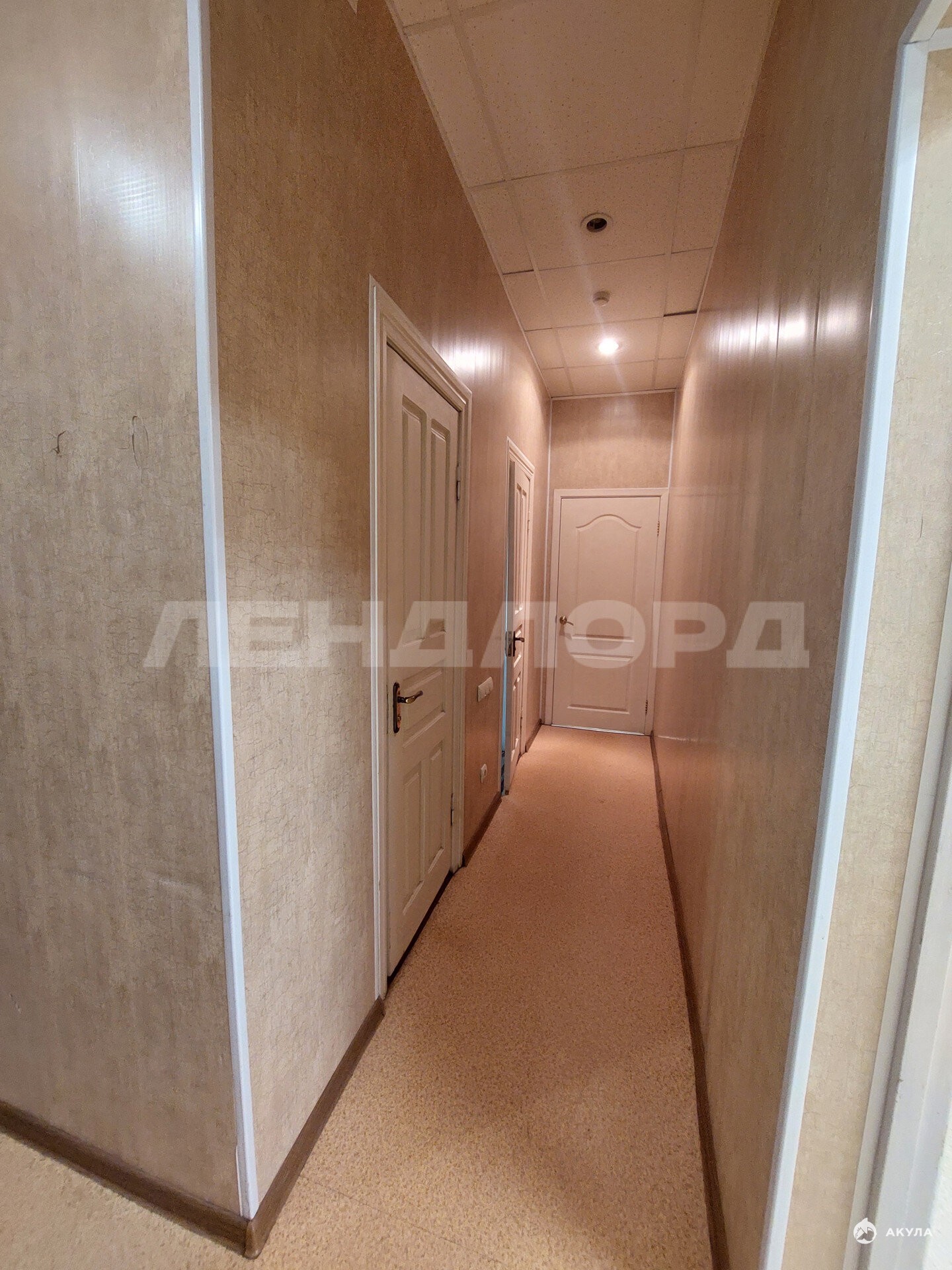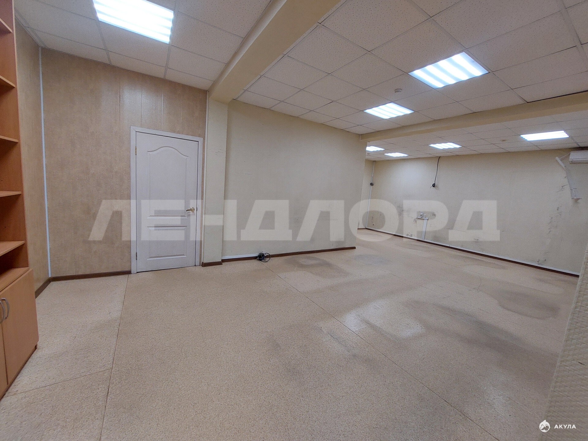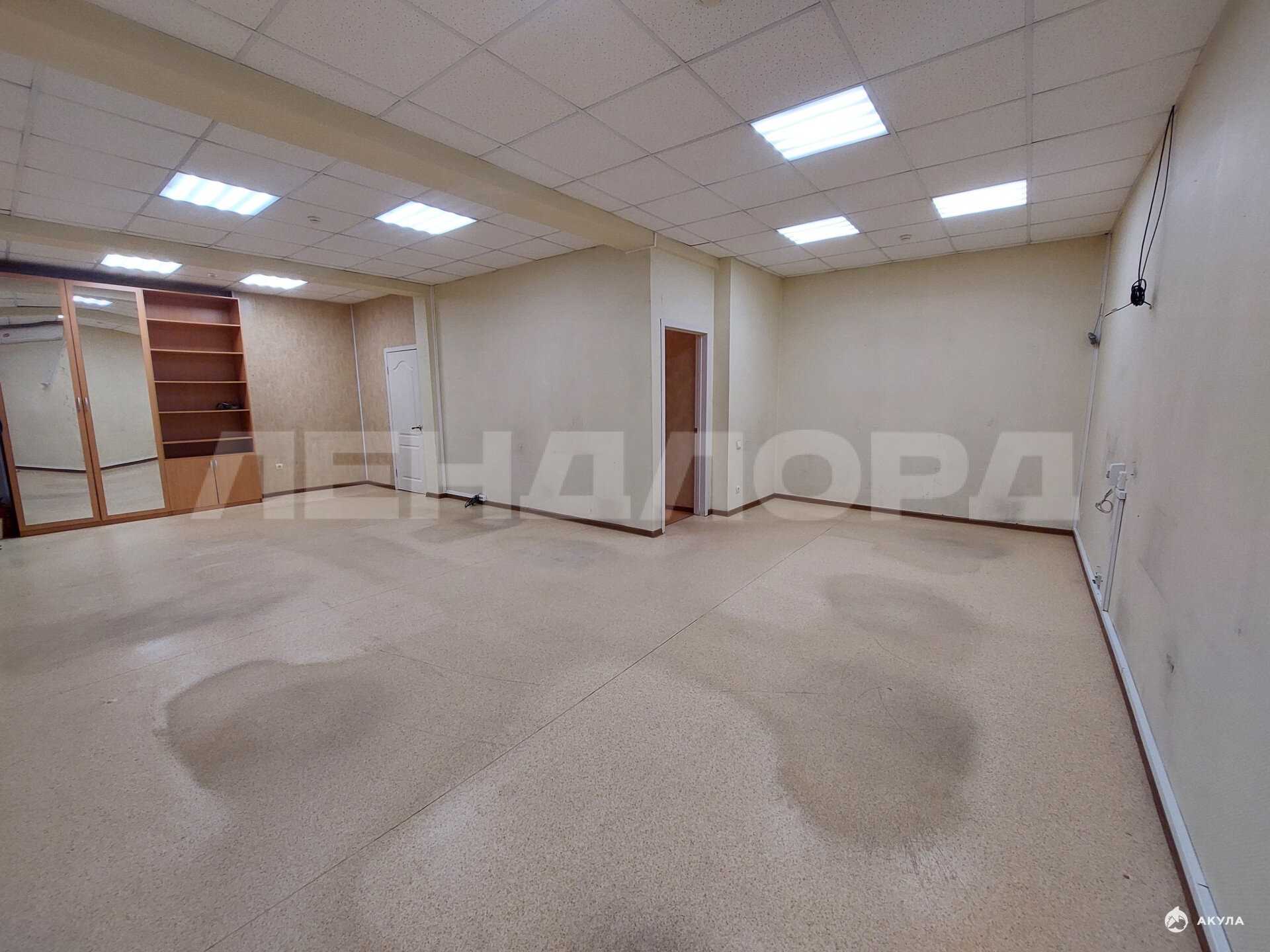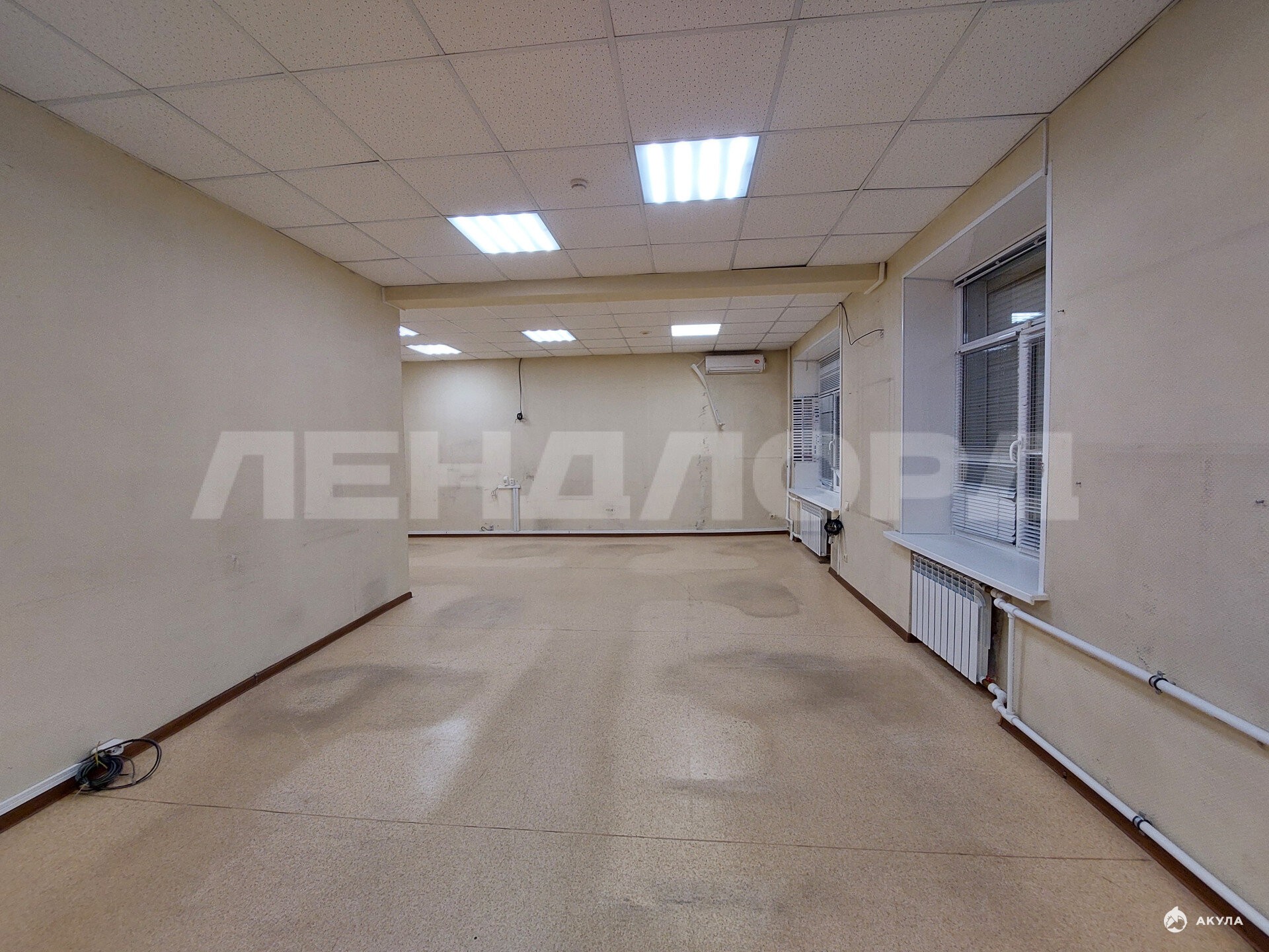 Стены, пол ровные. Потолок армстронг. Обои под покраску, на полу линолеум.