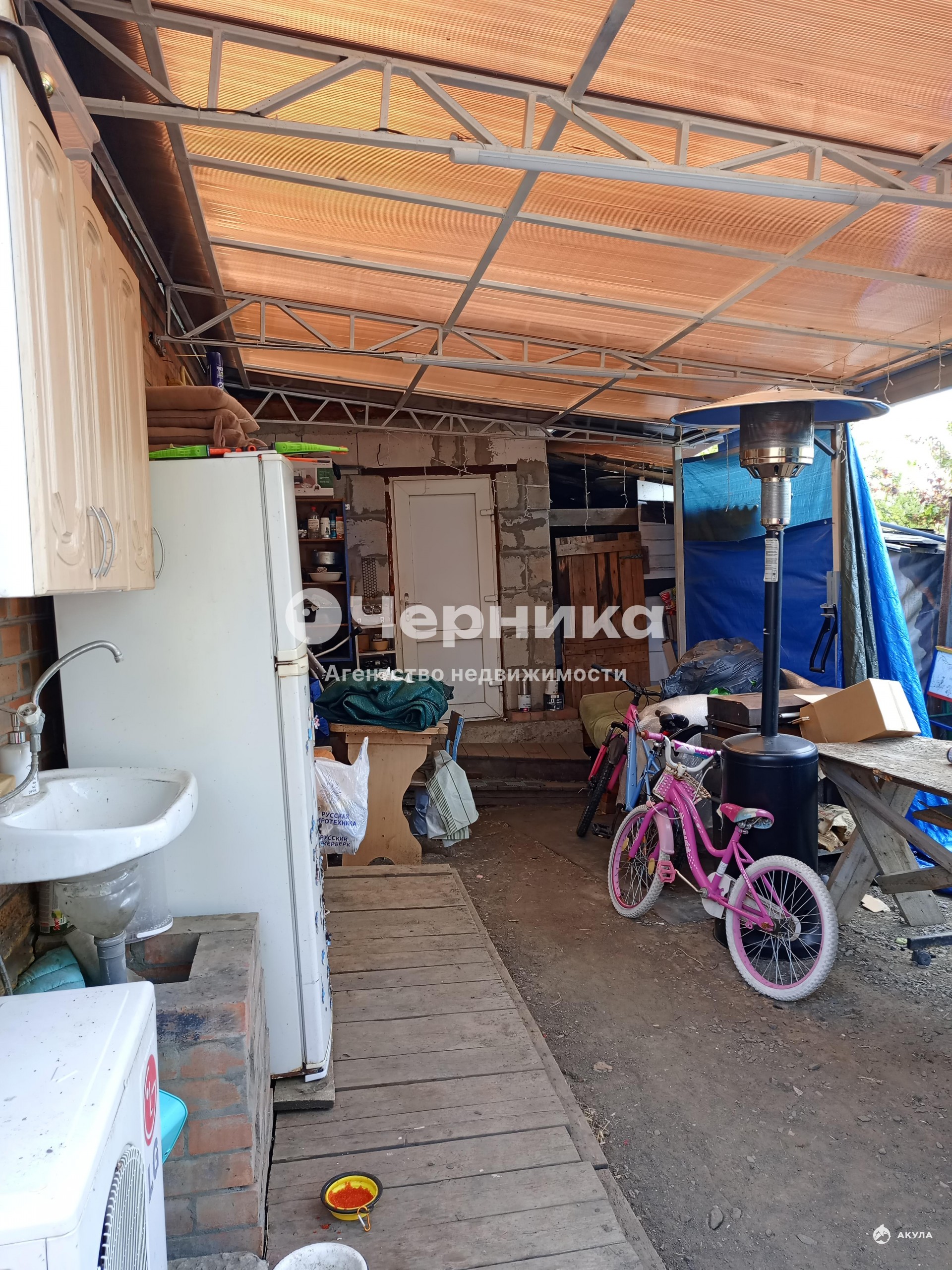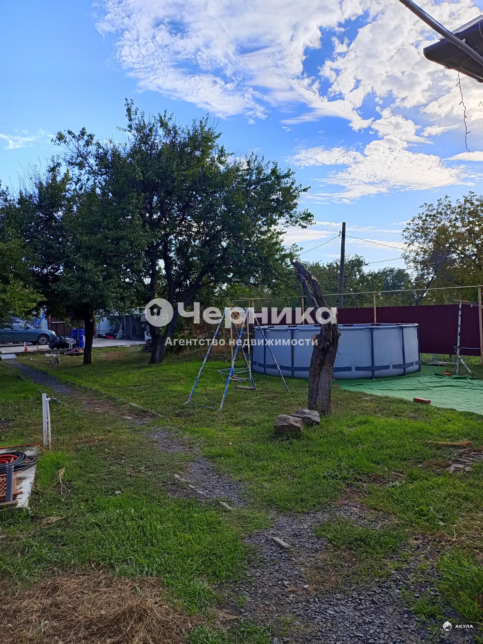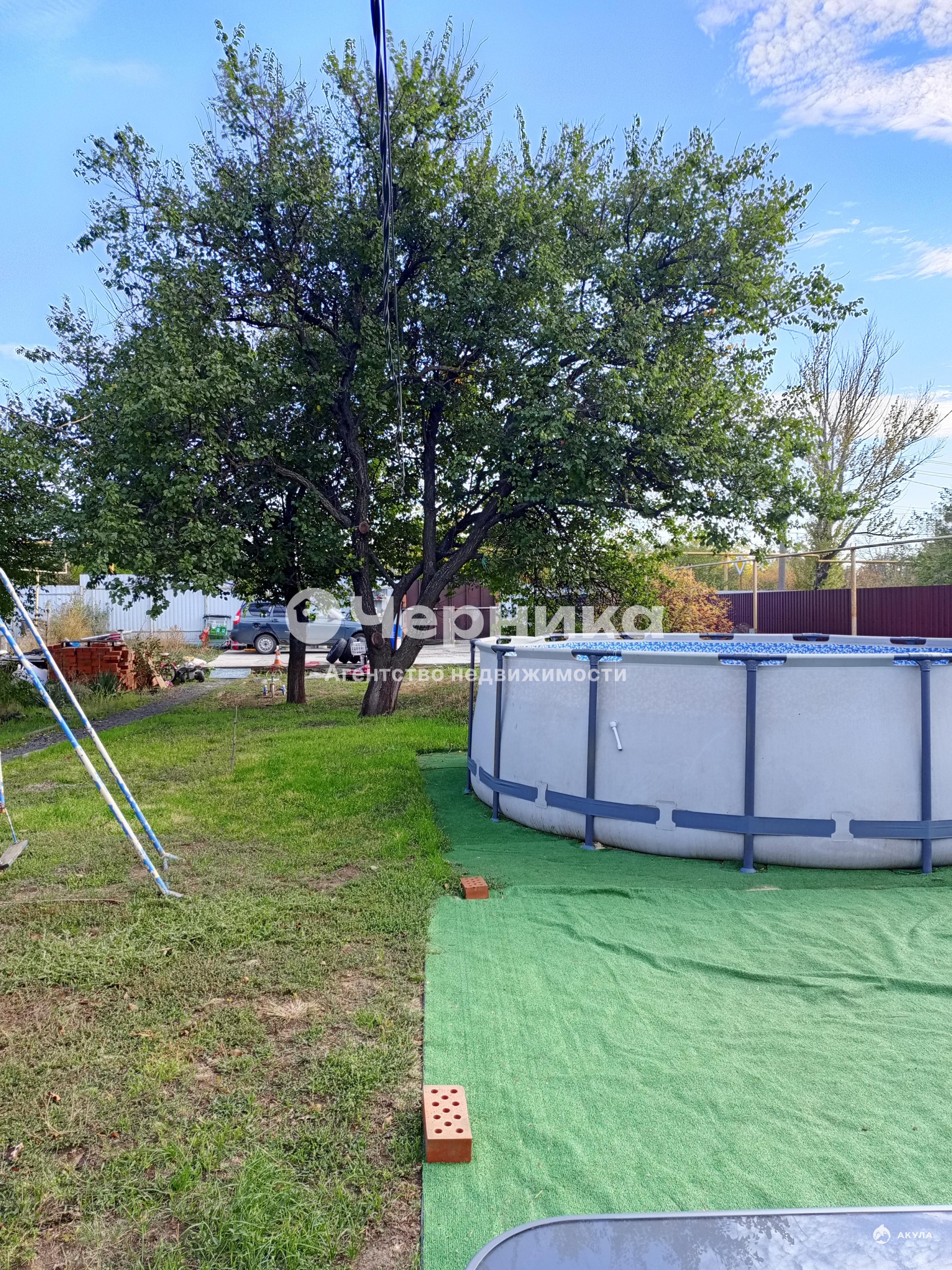 Во дворе есть навес, бетонированная площадка для машин, вольер для собаки, бассейн.