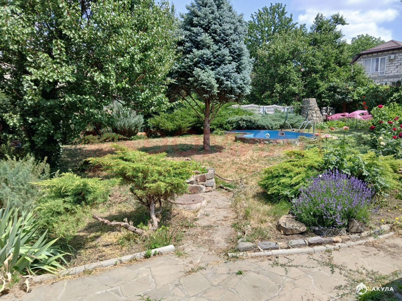 - Участок 6 соток — садовое пространство с множеством вечнозеленых растений: ель, туи, можжевельники. Это зоны отдыха или детских игр.