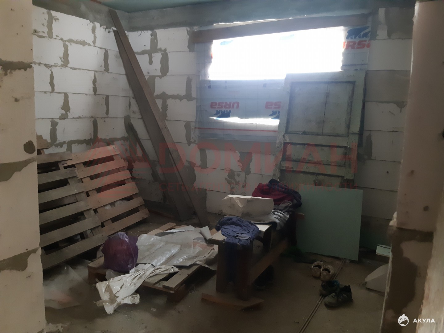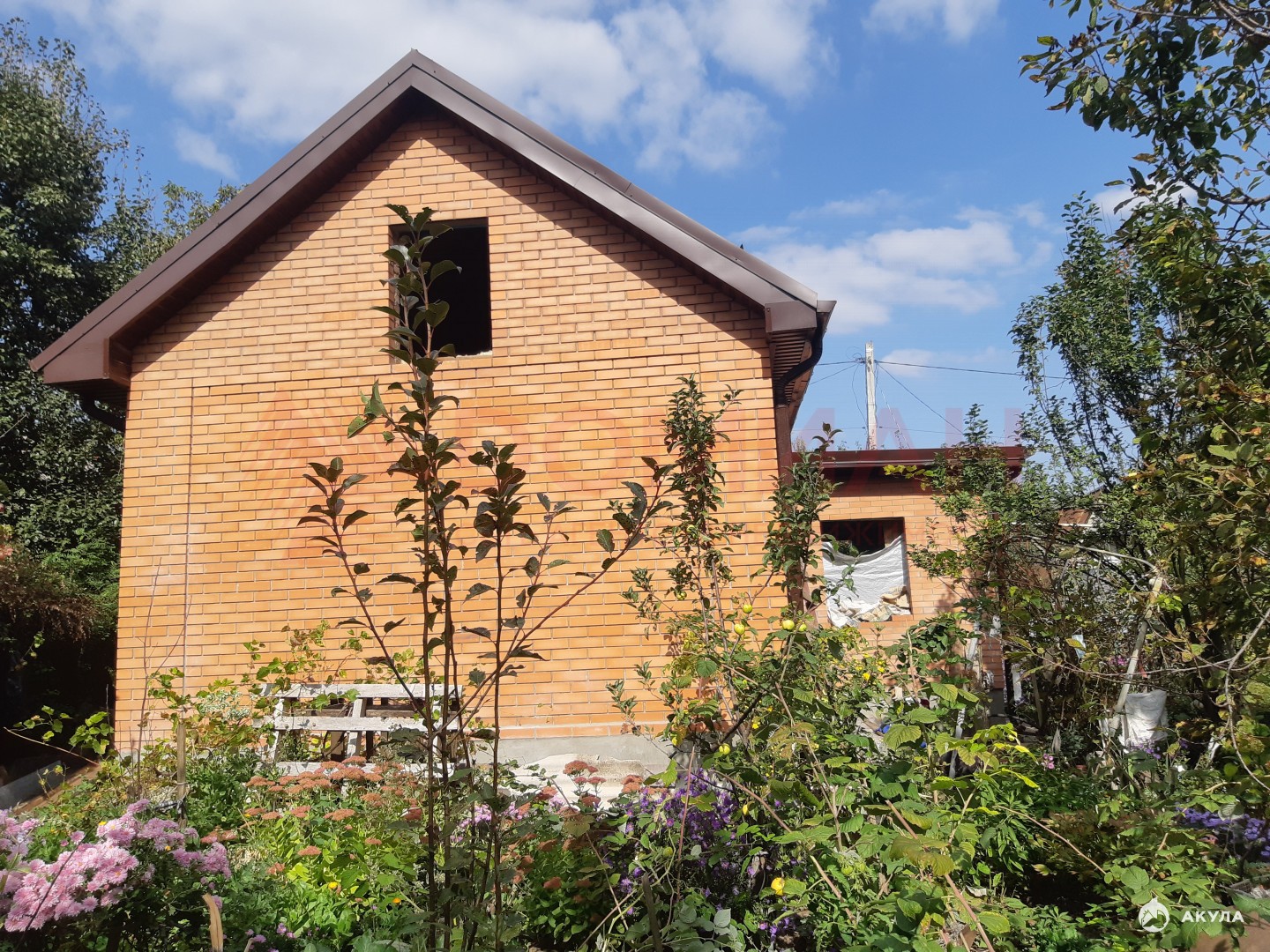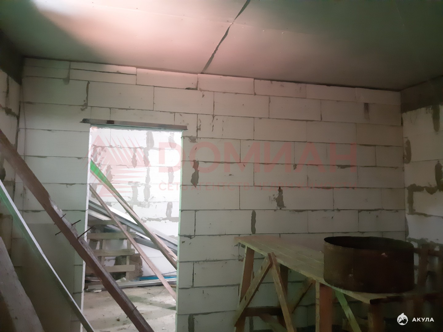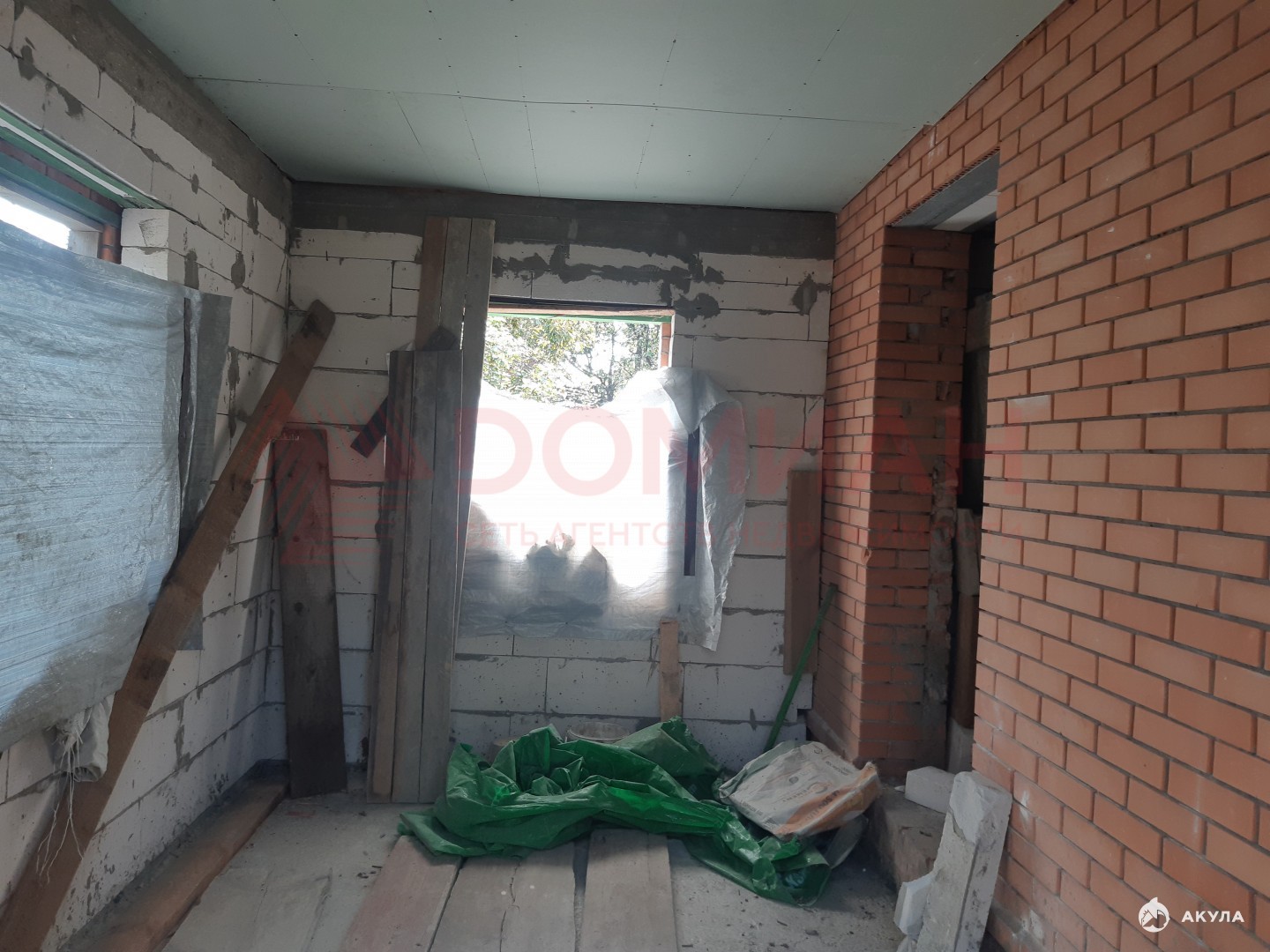 Коробка, крыша. Окон еще нет. Свет, вода на участке, есть счетчики. Газ по меже (пай проплачен).