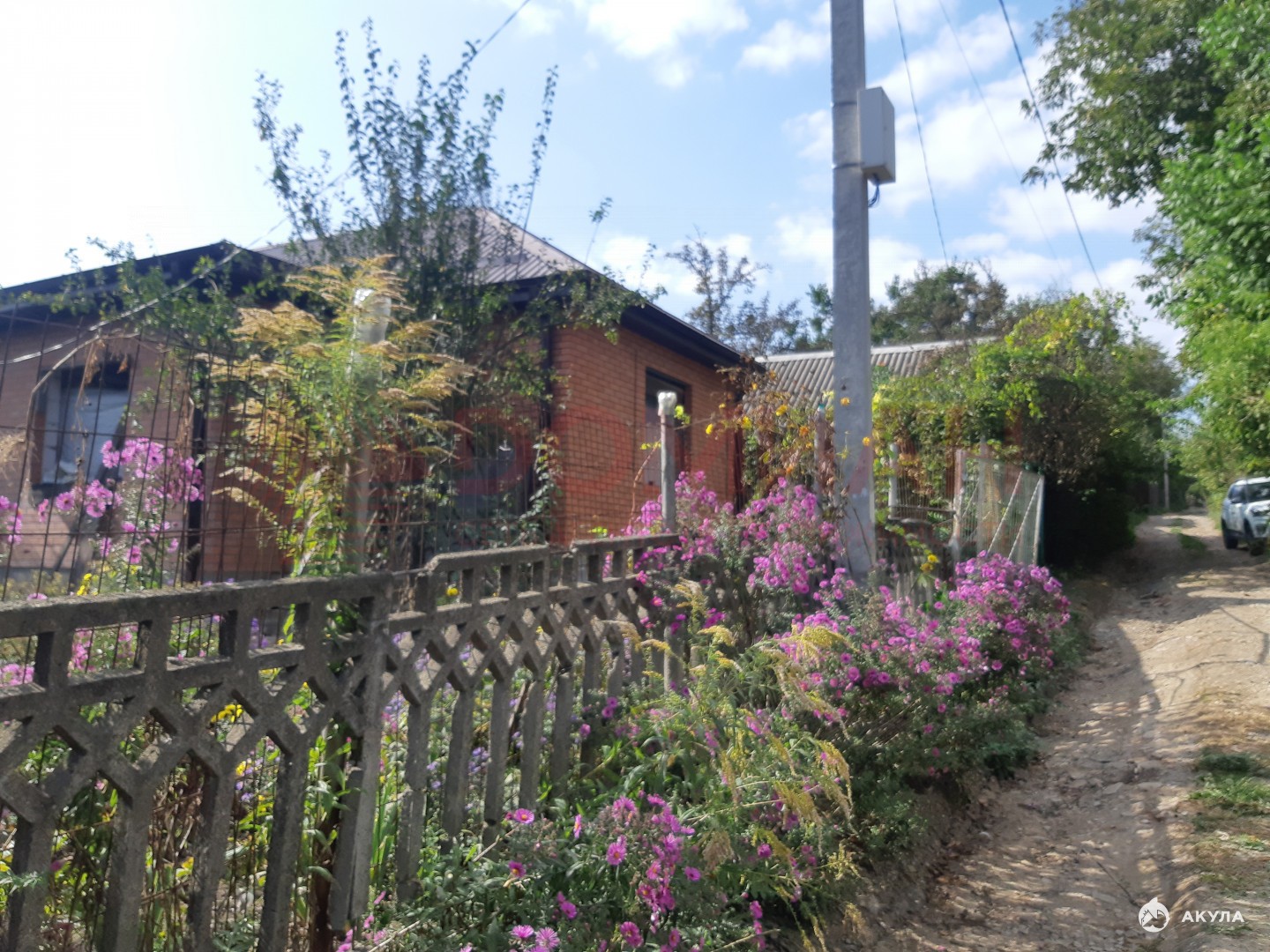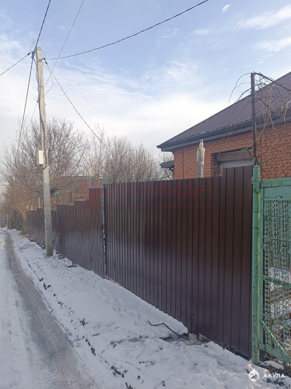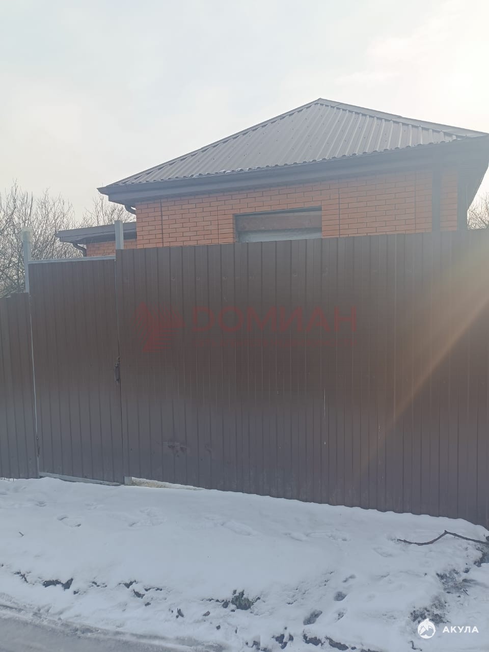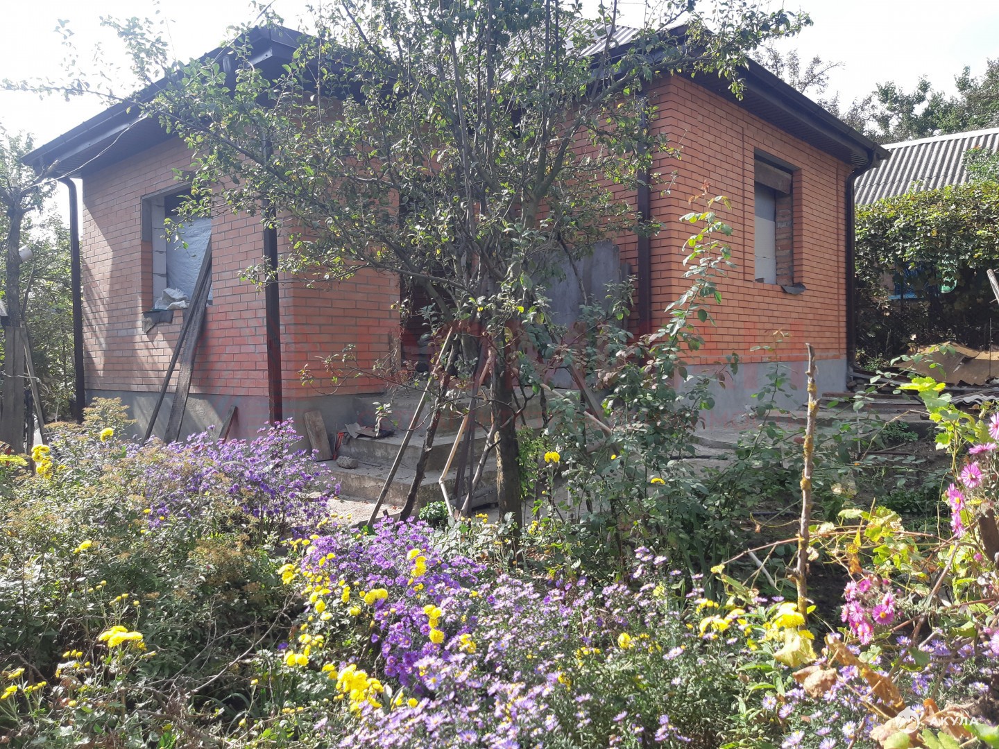 Коробка, крыша. Окон еще нет. Свет, вода на участке, есть счетчики. Газ по меже (пай проплачен).