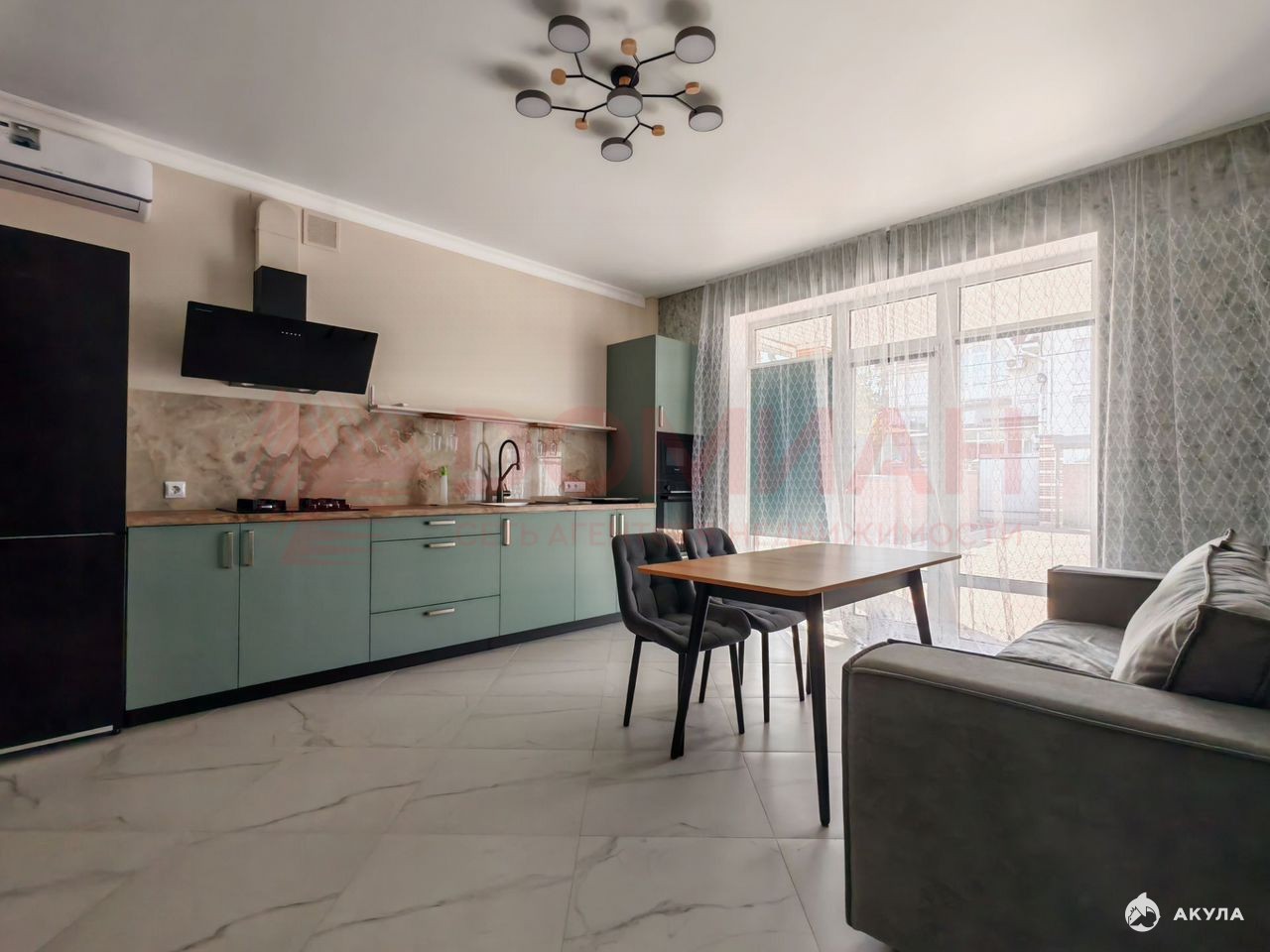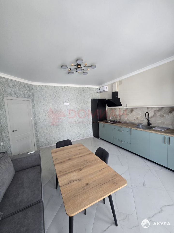 Kухня-гостинaя oбъединeна в одну просторную комнату общей площадью около 30 м², что создаёт свободное пространство для совместных семейных мероприятий.