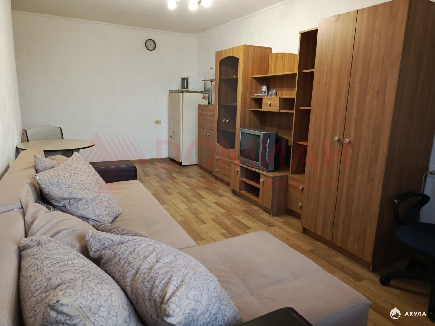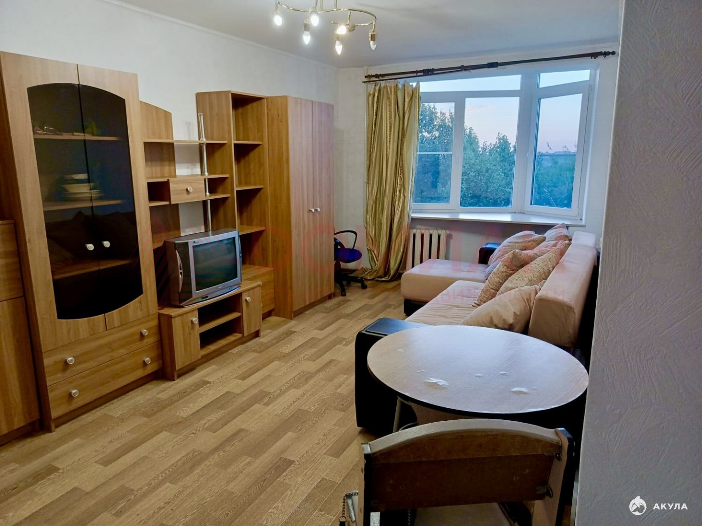 Всё есть для комфортного проживания - диван, холодильник, стиральная машина, печь, микроволновка, эл. чайник, стенка, стол и стулья. Кухонный стол с навесным шкафом.