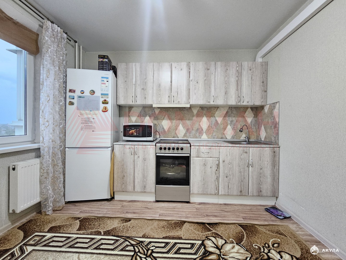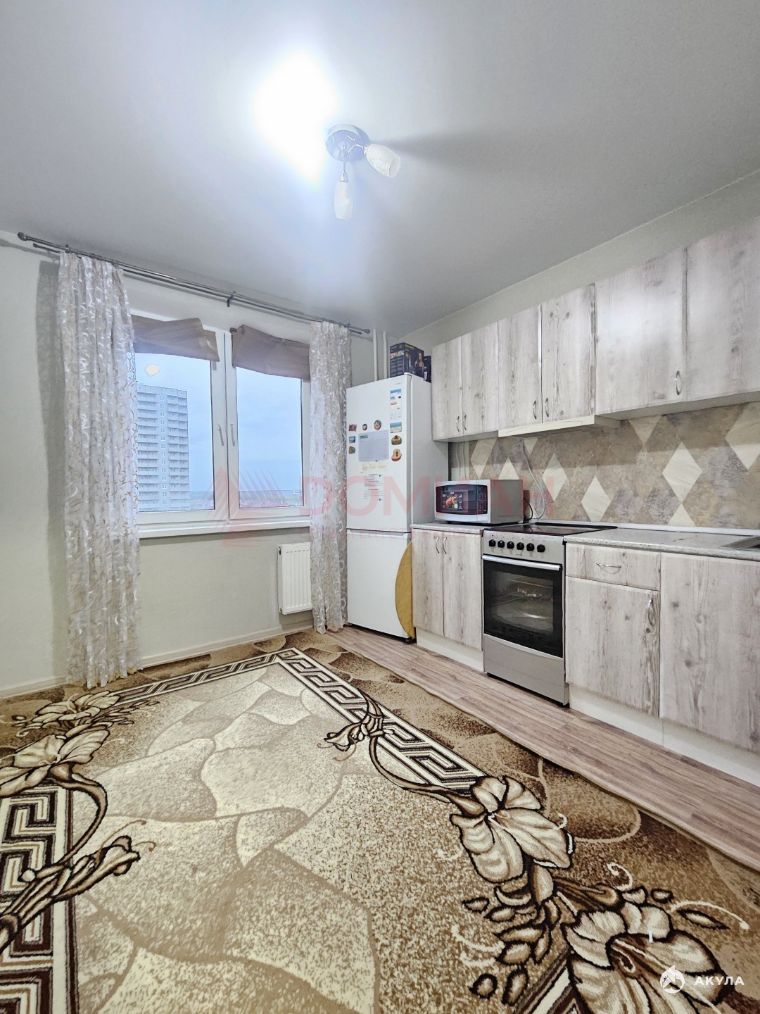 Просторная кухня оборудованная кухонным гарнитуром, холодильником, микроволновкой и новой электрической плитой ( не от застройщика).
