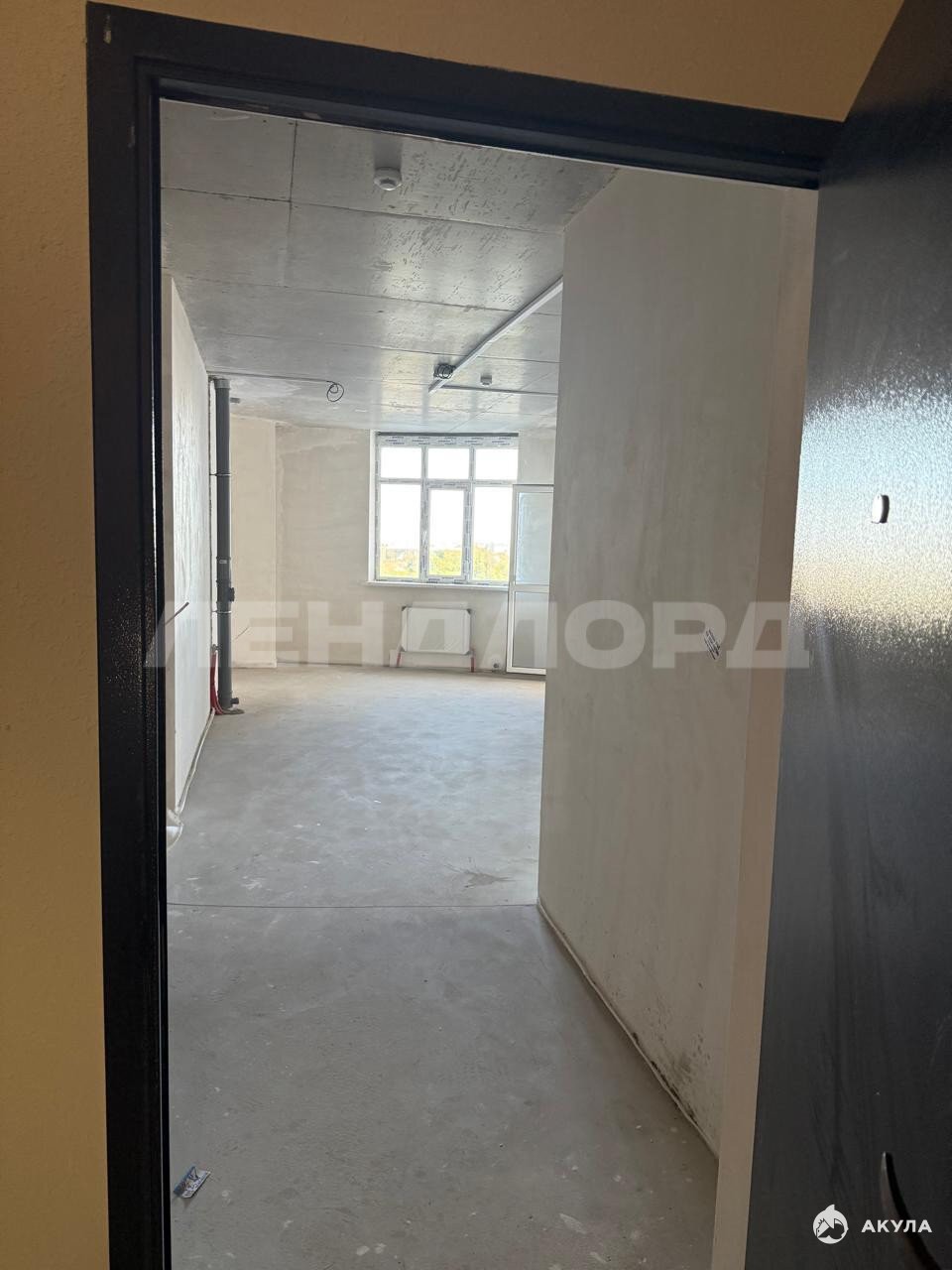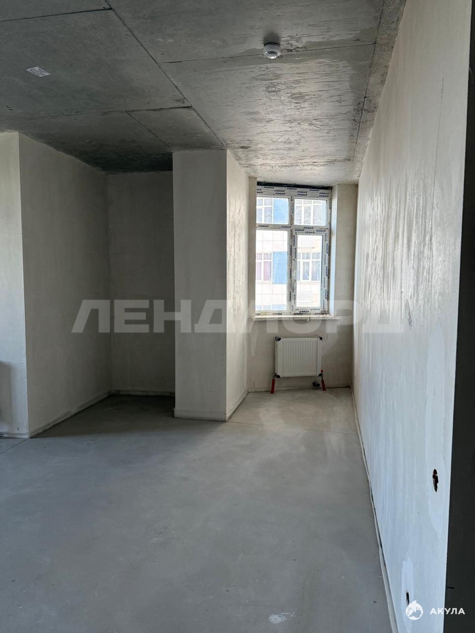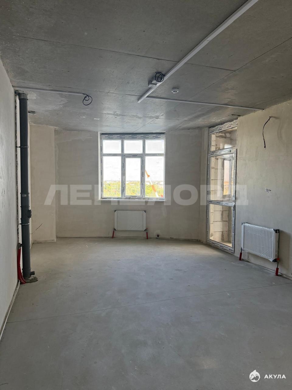 Планировка евро-два в предчистовой отделке: на полу выполнена cтяжка, штукатуpкa стен,