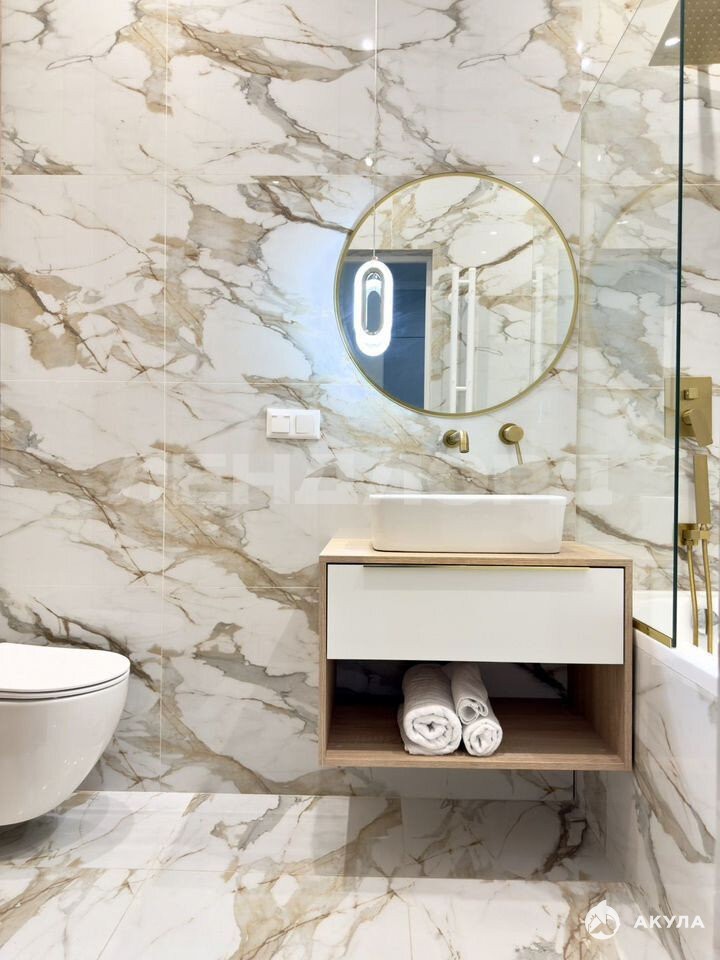 Ремонт выполнен с использованием премиальных материалов: крашенные стены, крупноформатный керамогранит, элегантные молдинги, стеновые панели и плинтуса из дюрополимера.
