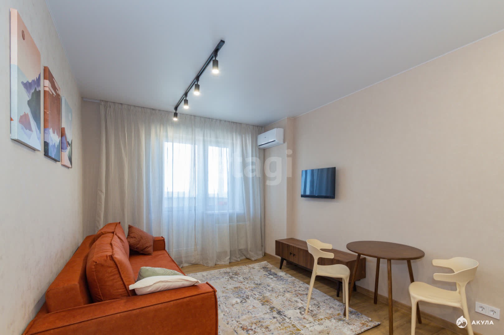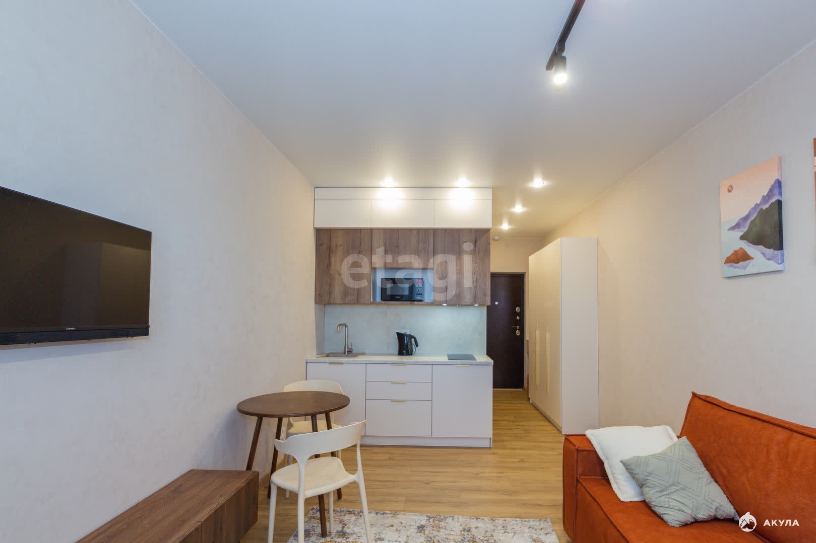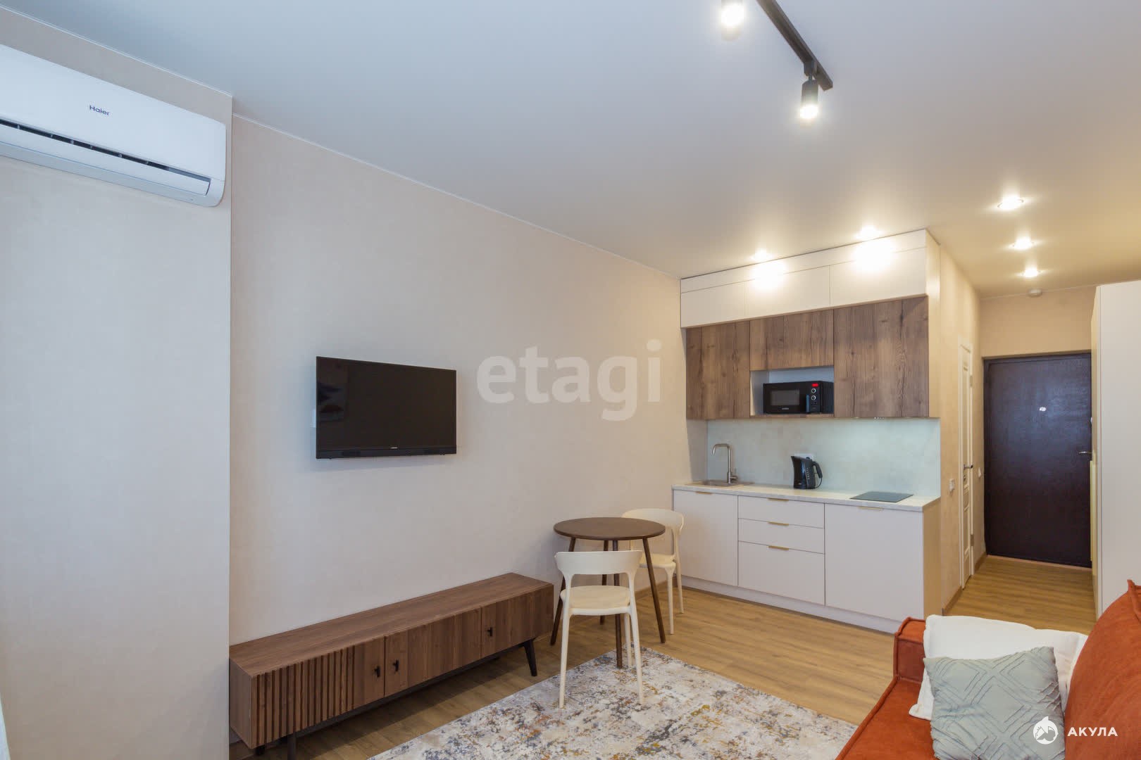 Имеется холодильник, телевизор, микроволновая печь, стиральная машина, сплит-система. Вся мебель делалась на заказ. Спальное место- хороший удобный раскладной диван.