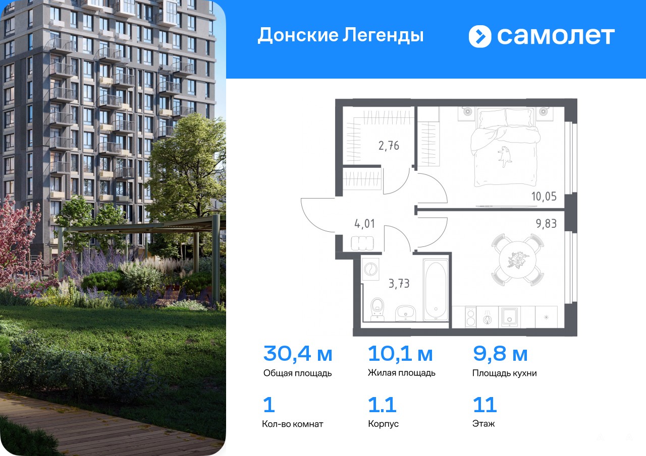 Предлагается 1-комнатная квартира комфорт-класса 30, 38 кв.м в корпусе 1.1 на 11 этаже, в ЖК «Донские Легенды»