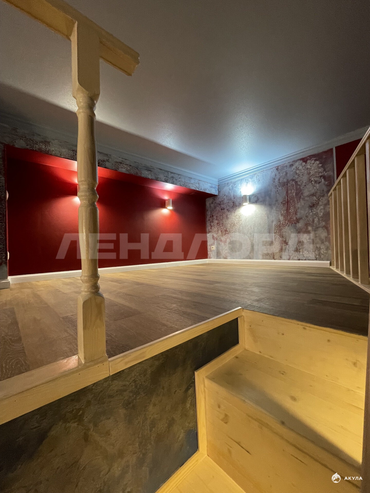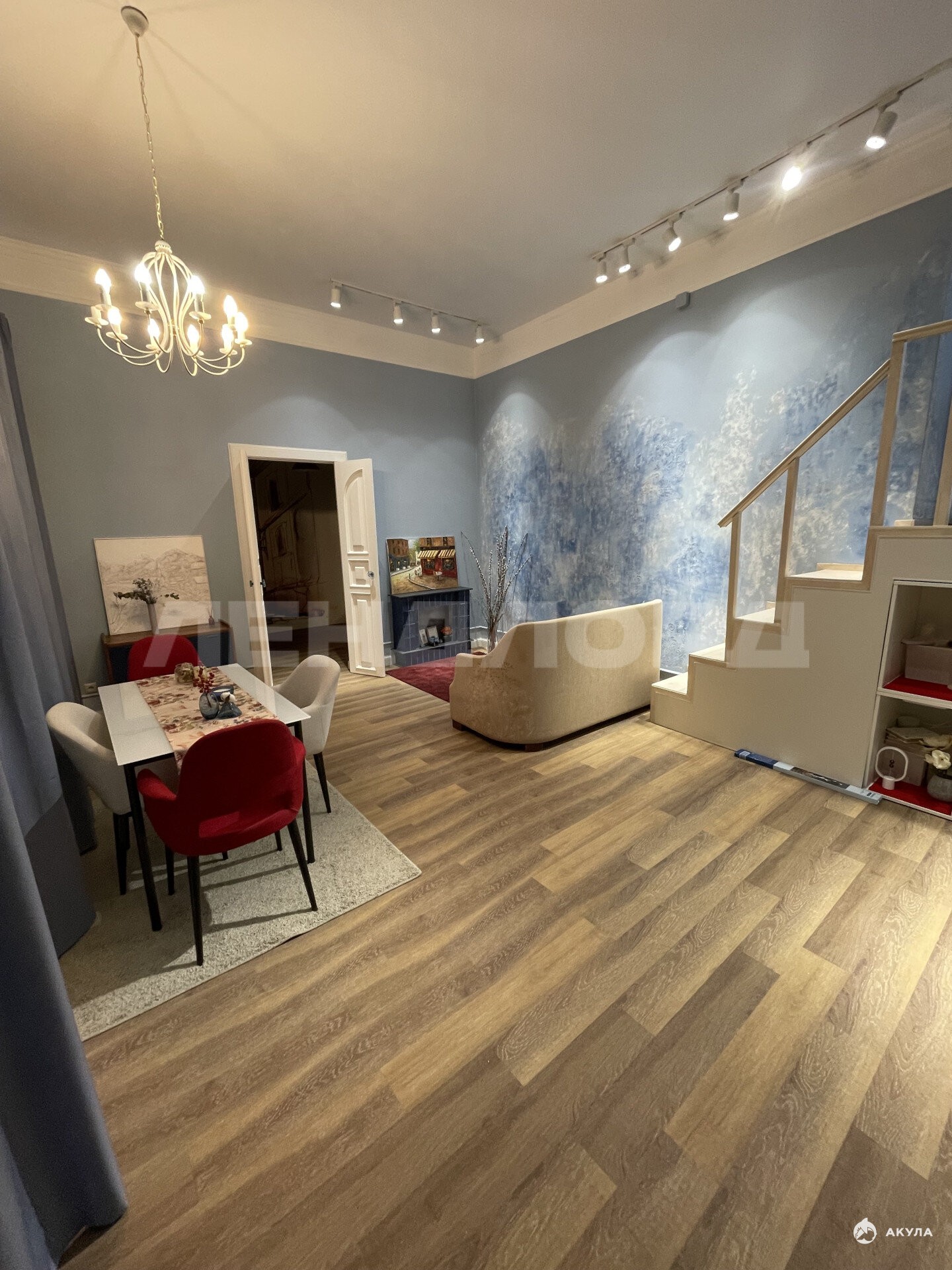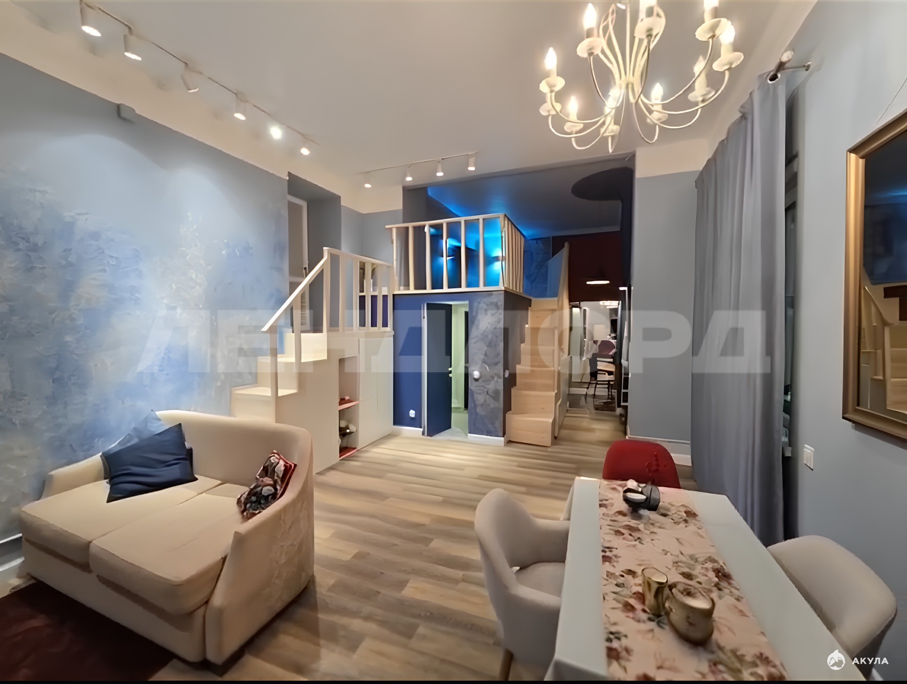1) Просторная комната (24, 90 м 2) центральное пространство квартиры. Её изюминка встроенный второй этаж, который идеально подходит для организации уединённой спальной зоны.