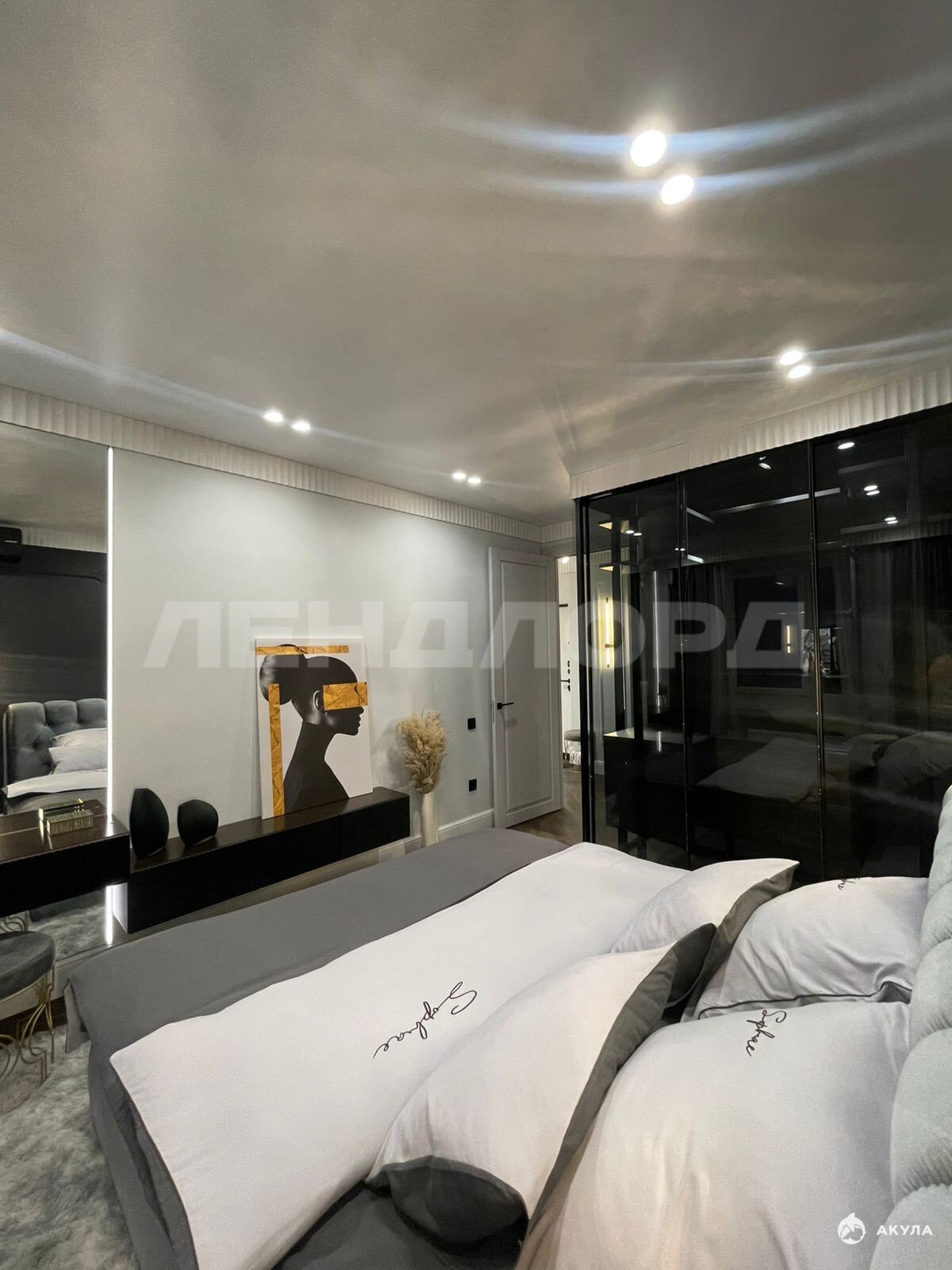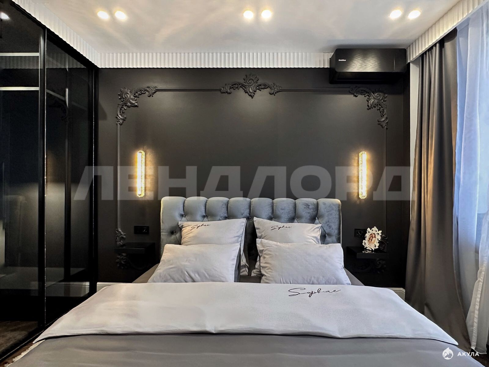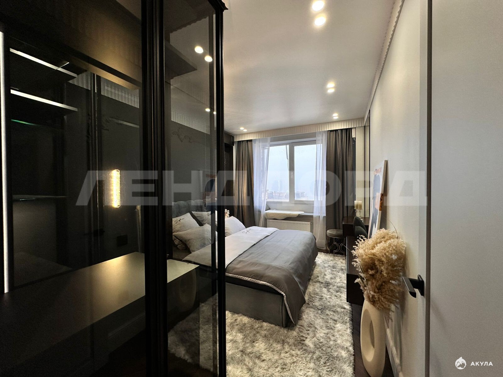 В спальне премиальная гардеробная, кровать kihg sizе, каменный подоконник для сиденья с прекрасным видом. Электрокарнизы (можно подключить к Алисе).
