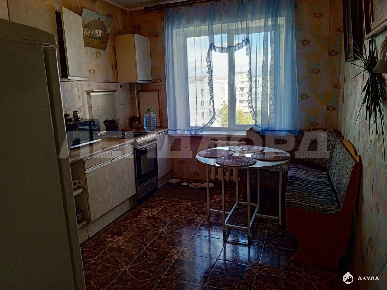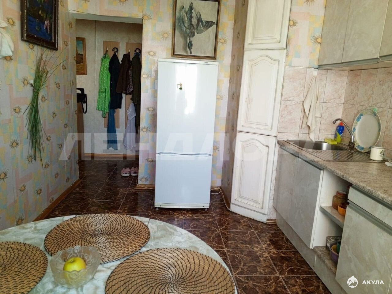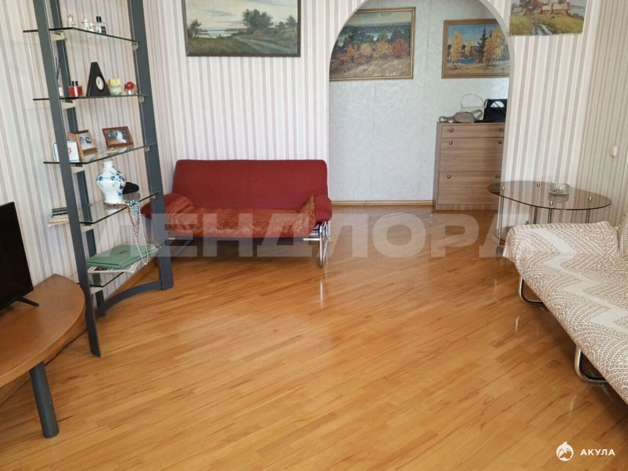 Стены обои, в жилых комнатах на полу паркет, на кухне плитка.