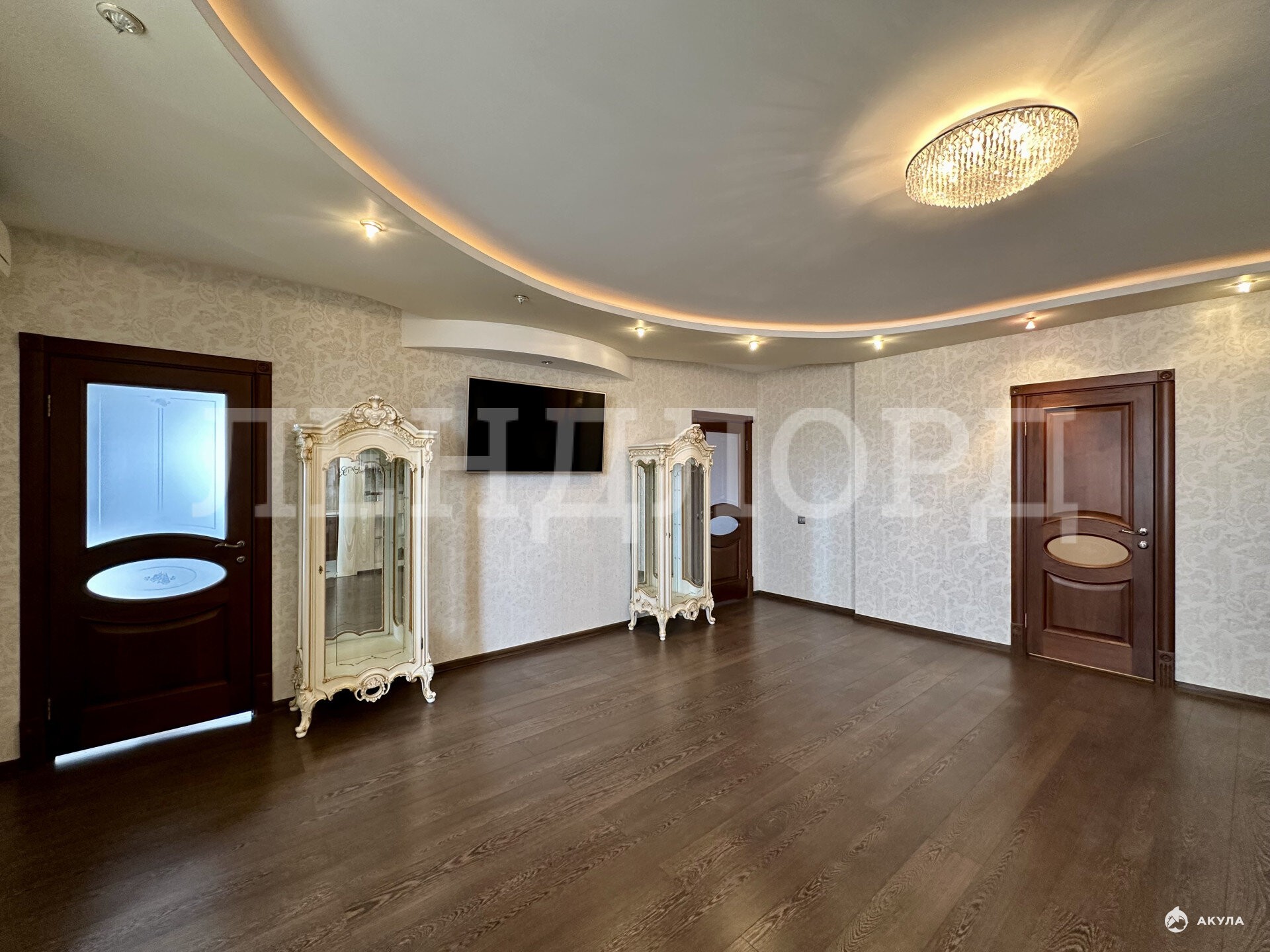 Квартира полностью укомплектована мебелью: встроенная кухня со встроенной техникой, большое количество встроенных шкафов, гардеробная, 2 двуспальные кровати, тумбочки, стол обеденный, рабочий, столик в спальне, пуфик, зеркала, 3 сплита .