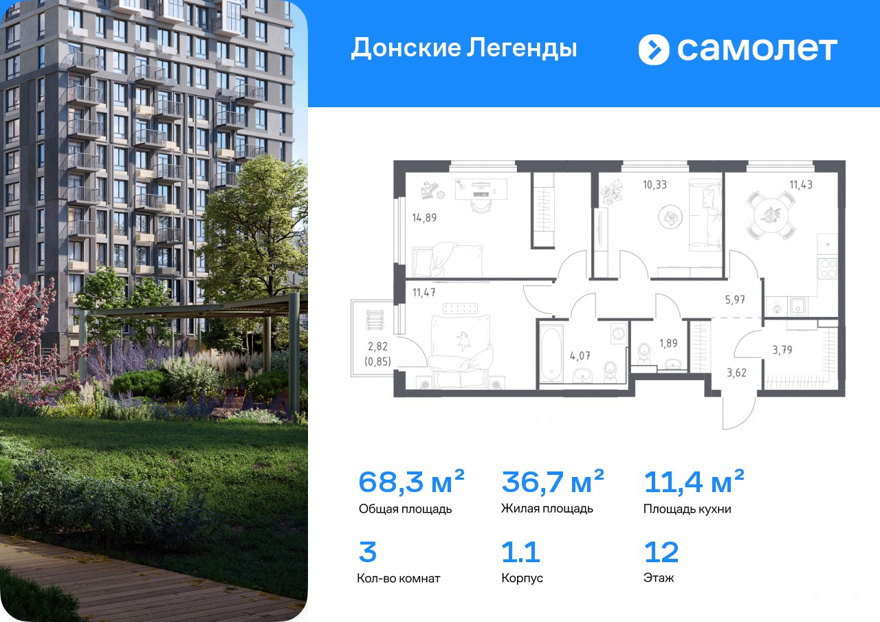 Строим кварталы для жизни с заботой о будущем. Предлагается 3-комнатная квартира комфорт-класса 68, 31 кв.м в корпусе 1.1 на 12 этаже, в ЖК «Донские Легенды»