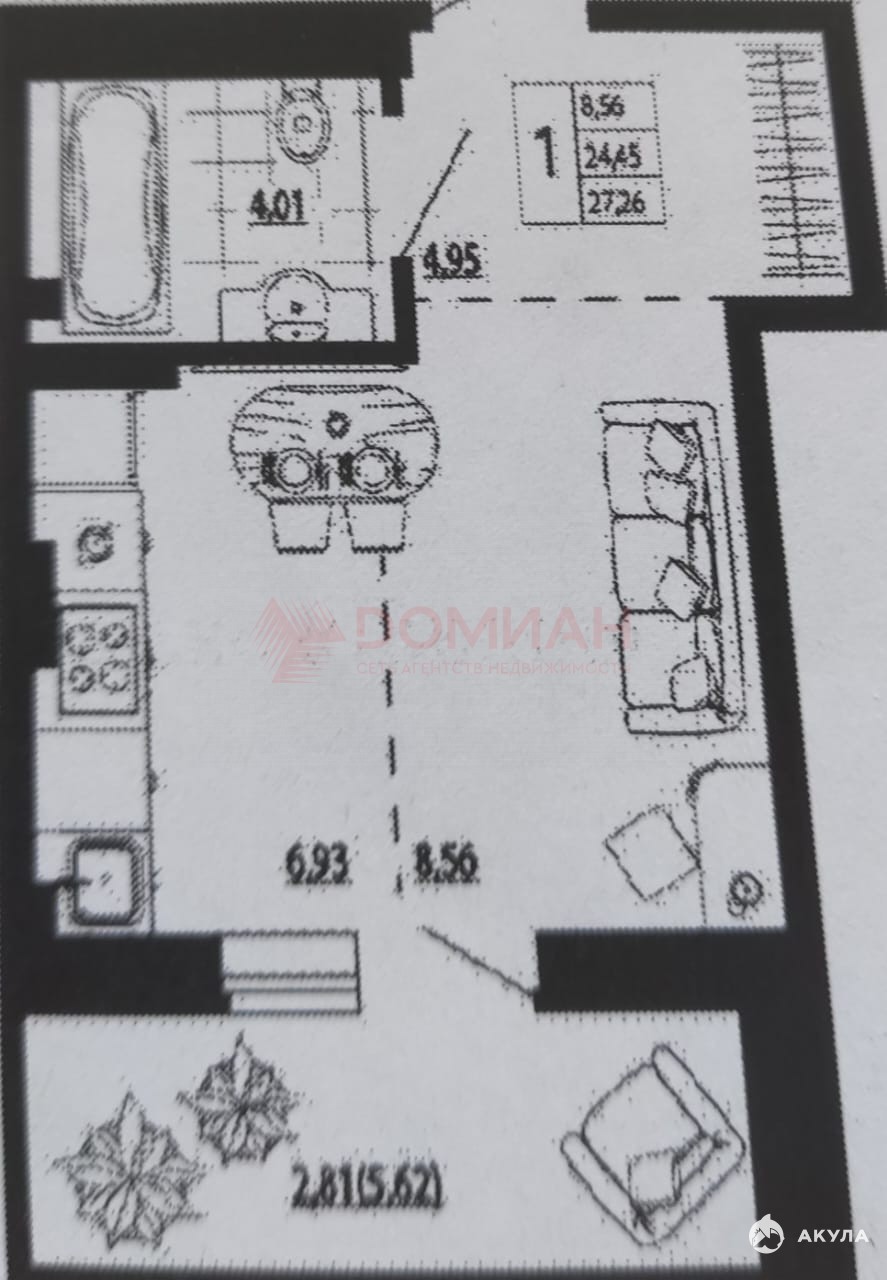 Общая площадь с застекленной лоджией 27.6 кв м.