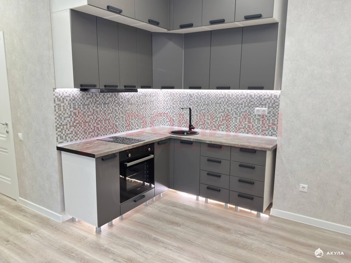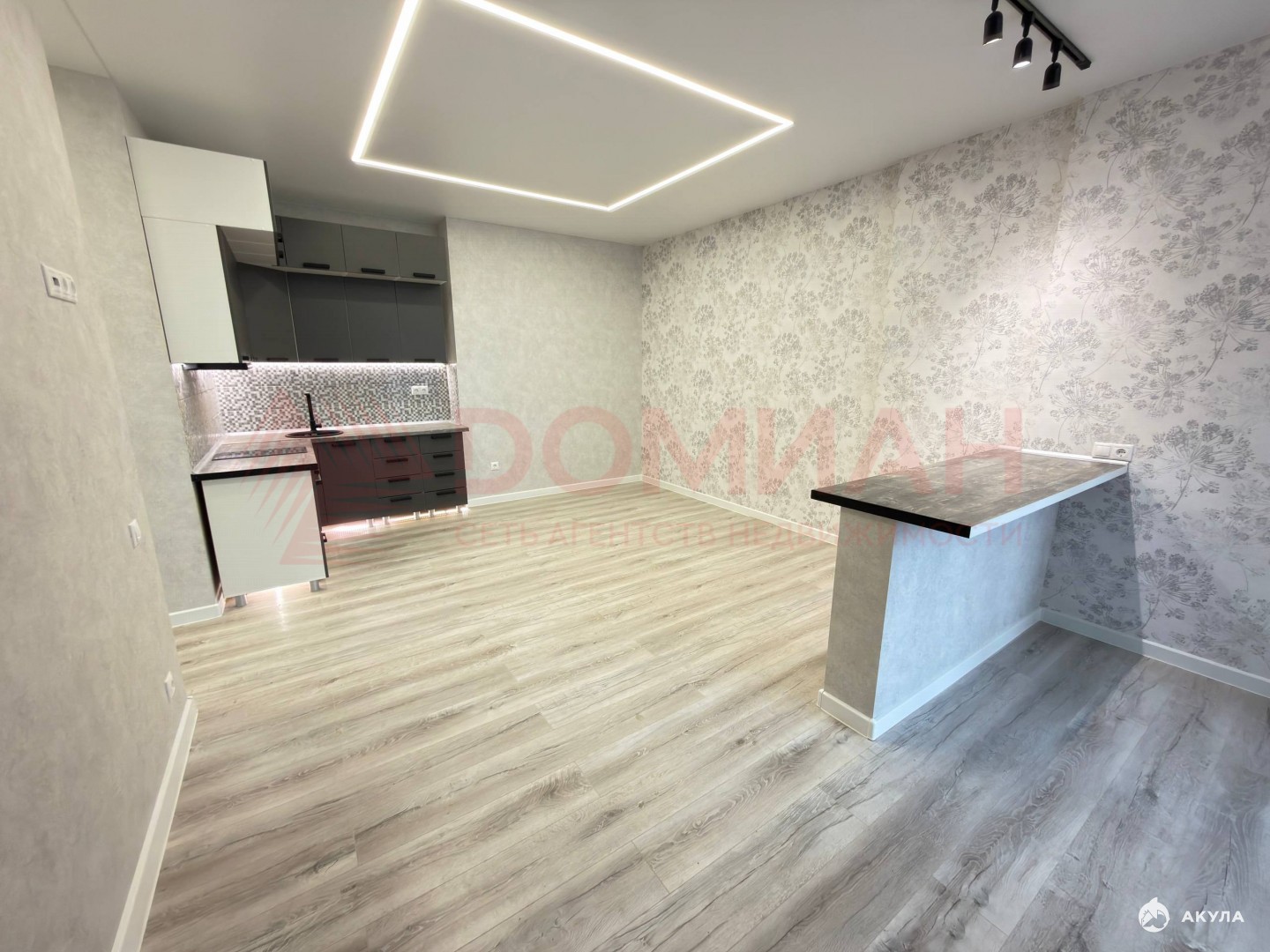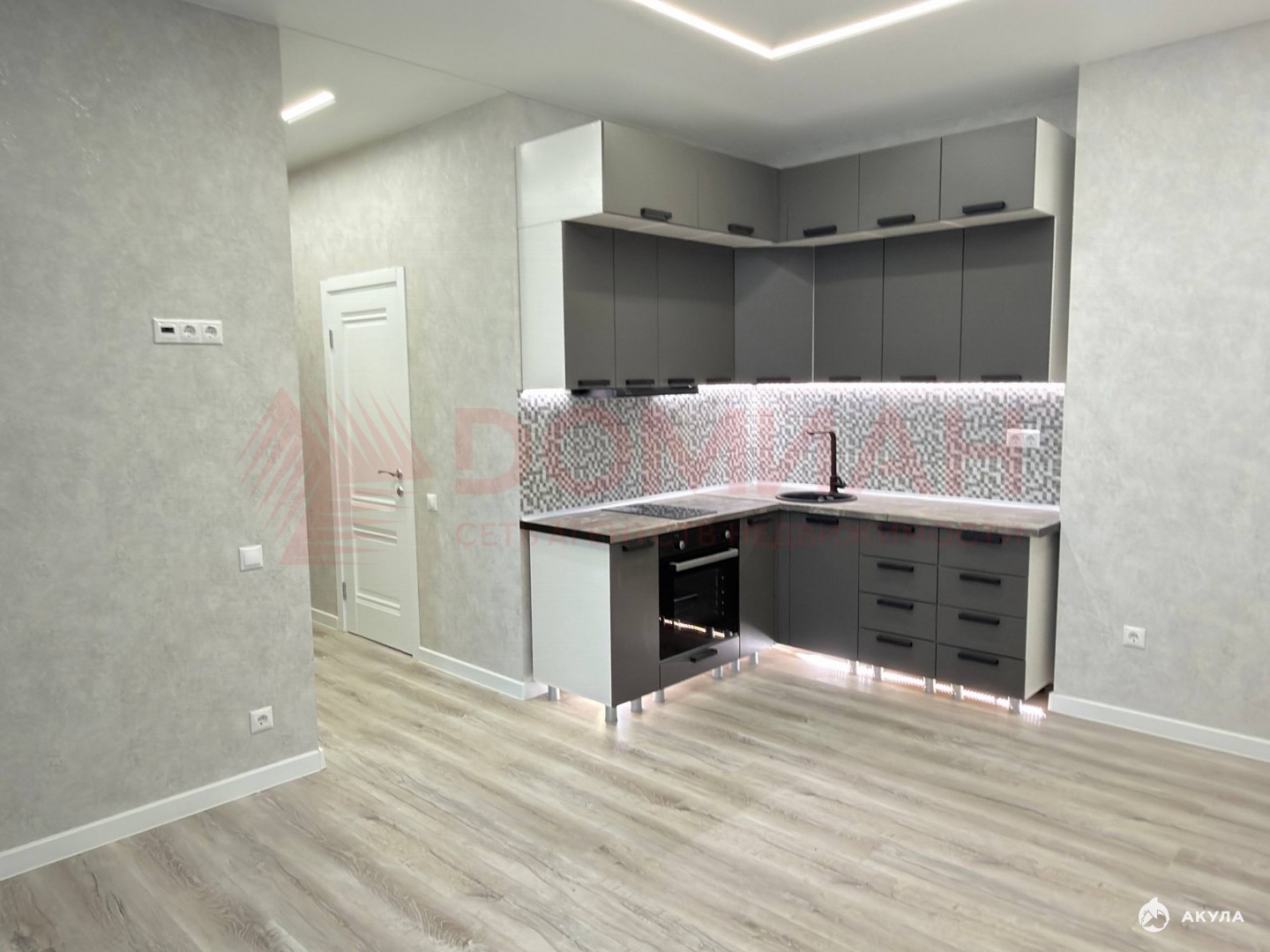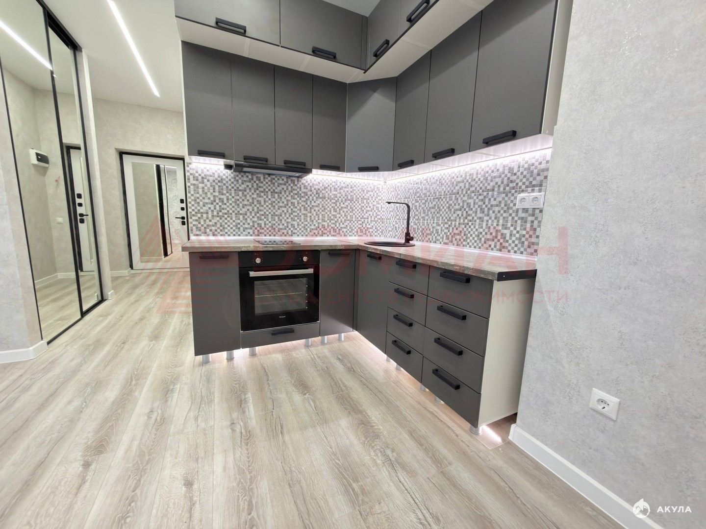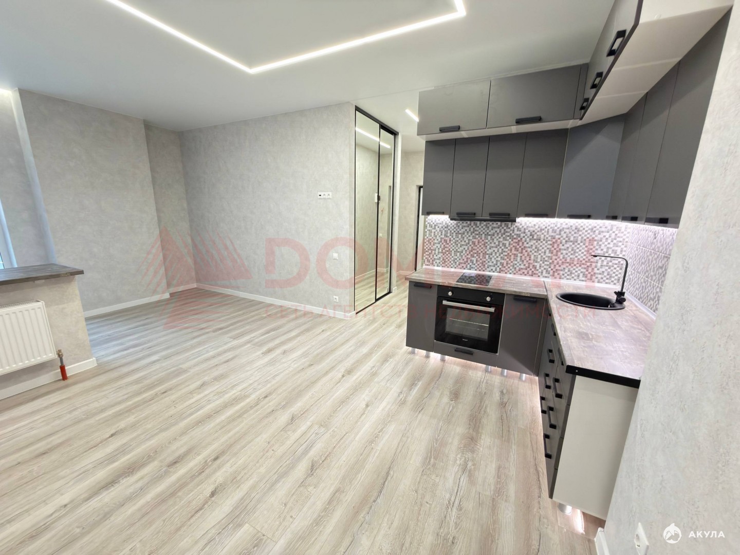 Сделана грамотная планировка позволяющая отделить гостиную зону от спальни. Kуxня cдeлaнa на зaкaз, установлена варочная панель, духовой шкаф.