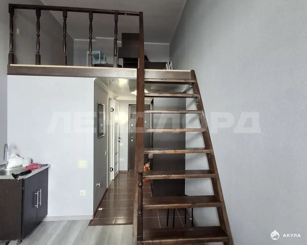 В квартире высокий потолок 4 метра, что позволило сделать второй этаж с полноценной спальной зоной, значительно увеличив жилую площадь. На первом этаже, располагается кухня совмещенная с лоджией, санузел, коридор.