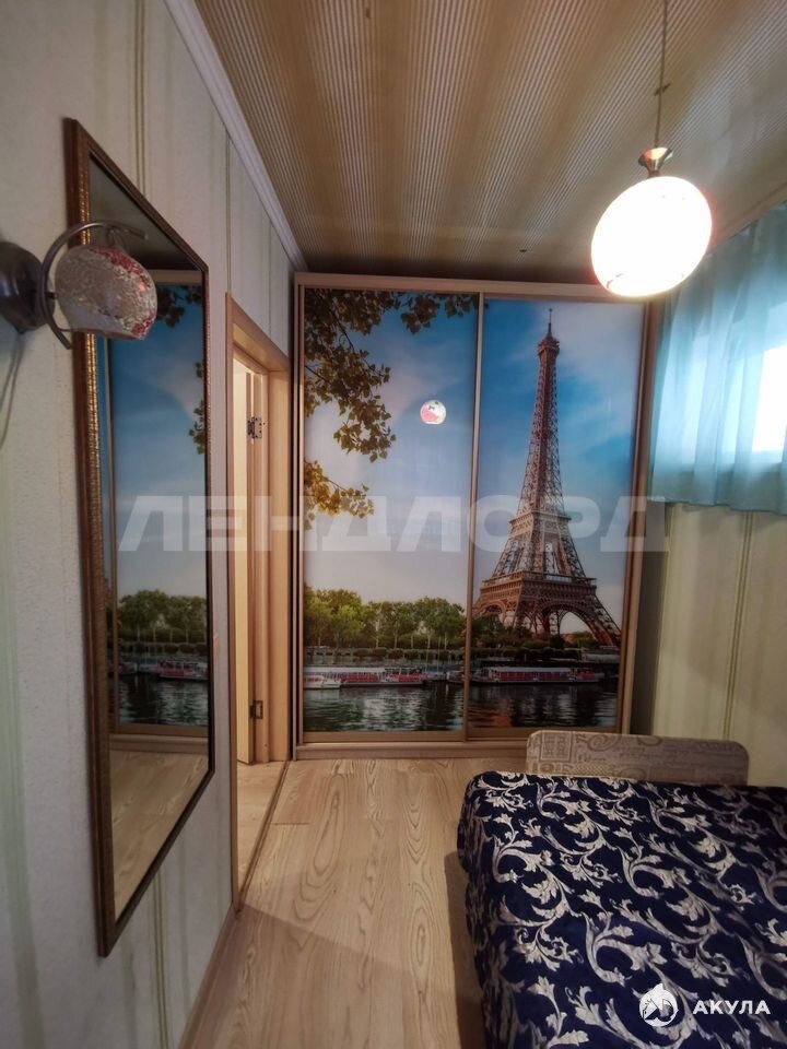 Шкаф-купе, диван, кровать, тумбы, кухня, холодильник, стиральная машина.