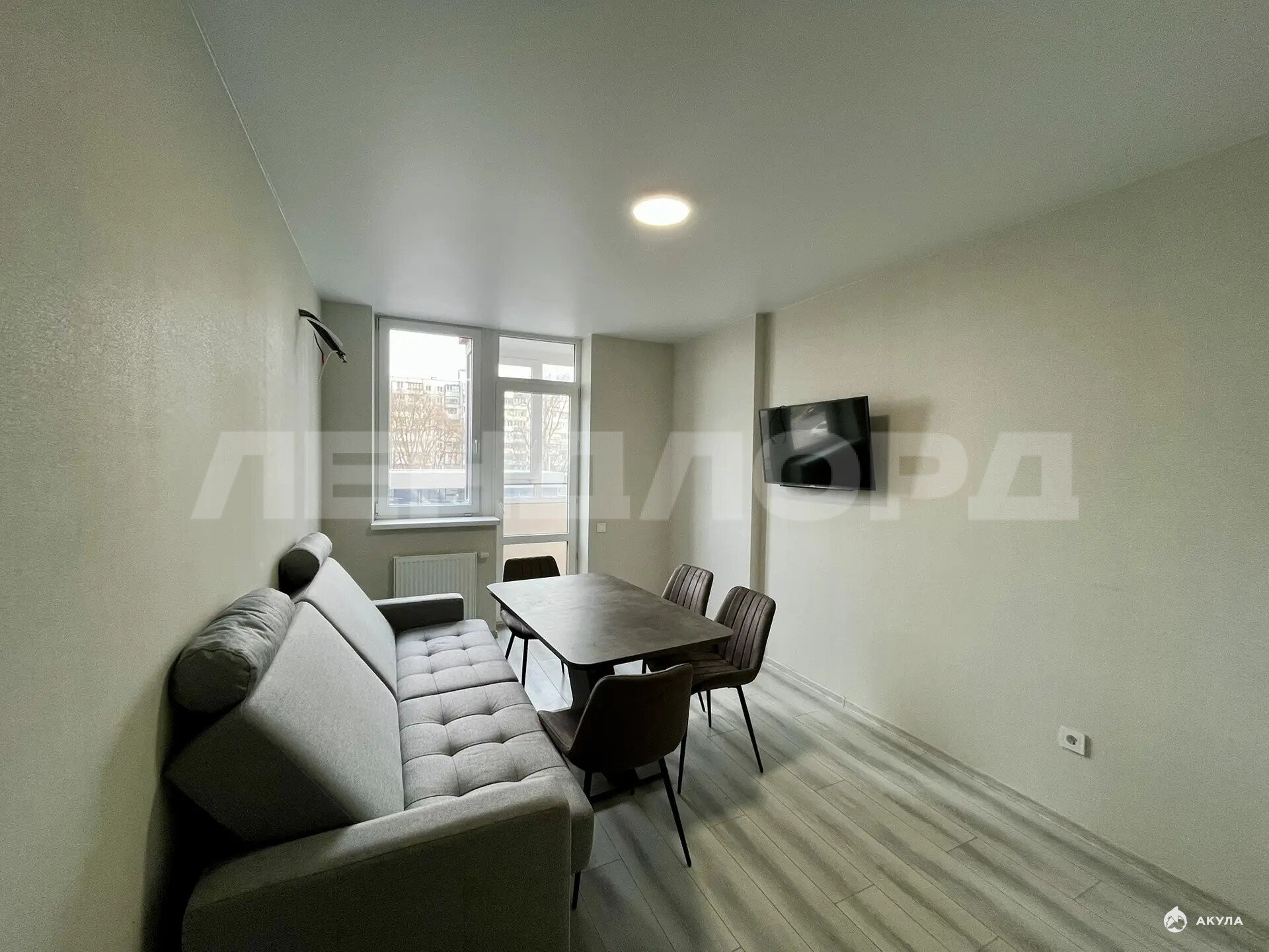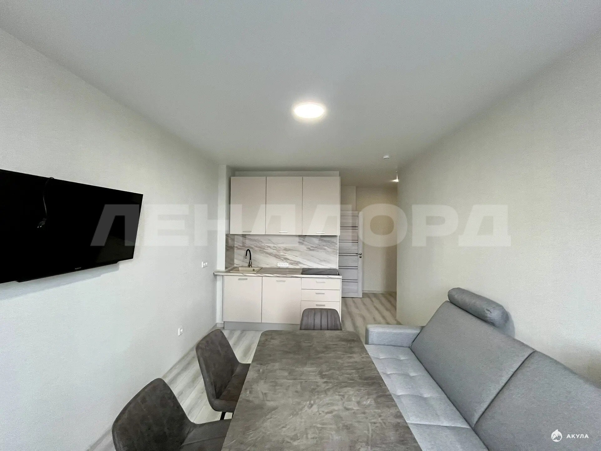 Просторная кухня-гостиная с телевизором и две изолированные комнаты.