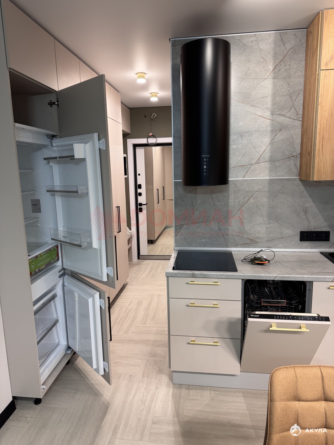 Вся техника встроенная. Установлена посудомоечная машина., встроенный холодильник.
